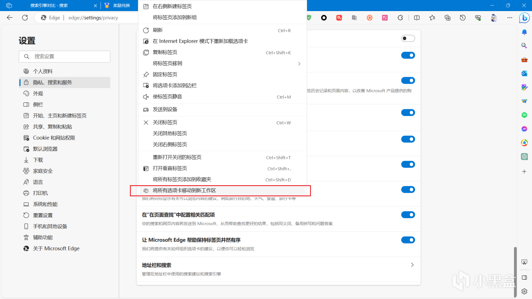 同時也可以右鍵,找到最下面的,將所有選項卡移動到新工作區,這樣可以直接創建一個工作區,同時給你保存你所瀏覽的網站,在下次打開的時候可以直接打開工作區即可接着瀏覽(爲什麼寫的那麼不對勁?我是正經人)