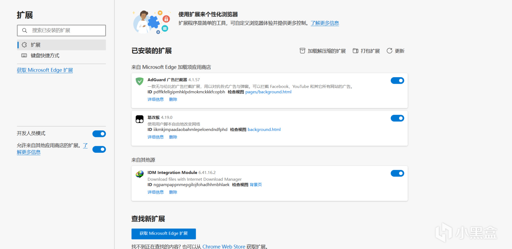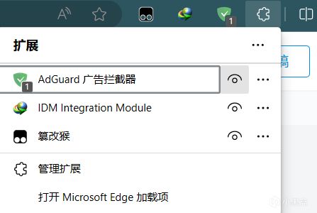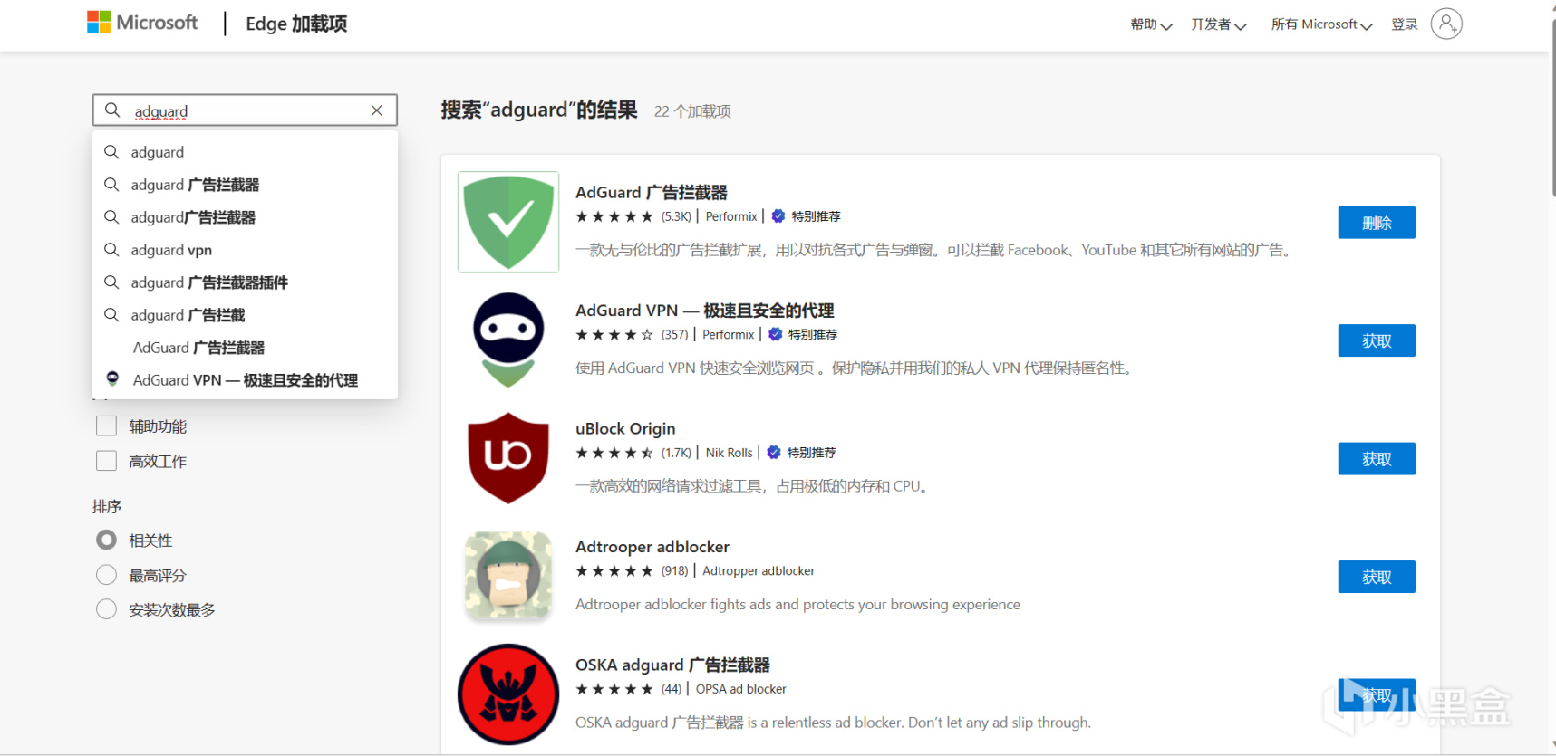 打开开发人员模式,获取Microsoft Edge扩展,输入AdGuard,安装第一个绿色的扩展即可