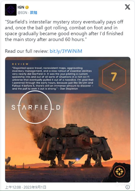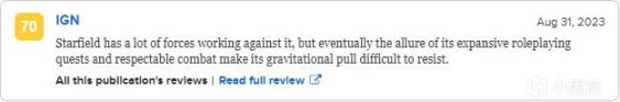 另一方面,IGN(美国本部)仅给出70分 认为《星空》面临许多缺点,但最终其广阔的角色扮演任务,和令人尊敬的战斗,使其吸引力令人难以抗拒。