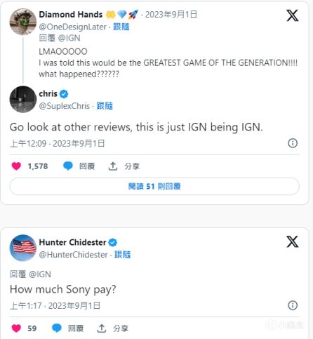 在IGN 推文下方,不少玩家表示70 分确实有点太低,还有人质问是不是被Microsoft 的死对头Sony 给收买了,毕竟其它分部如IGN 法国和日本,以及游玩Xbox 版的IGN 巴西(95分)西班牙(100分)都给出高分好评,且Metacritic 和OpenCritic 双评分网均分也有88 分。