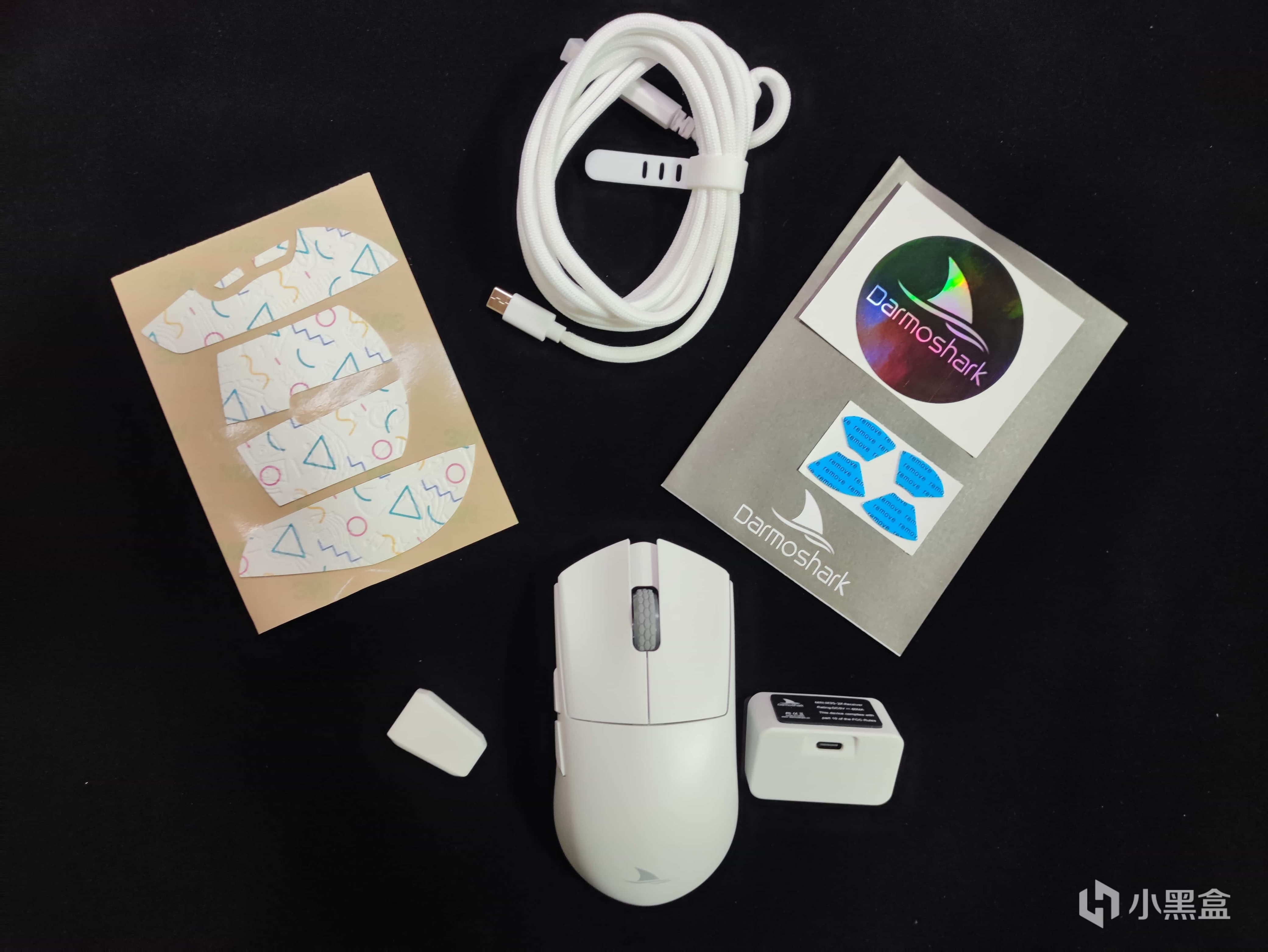 全家福:一根數據線,一個2k接收器,一張橡膠貼,一個腳貼,一個2.4g接收器延長器,一個達摩鯊的貼紙,一張說明書。