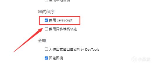 3.设置栏往下滑,找到“调试程序-停用JavaScript”,打上勾