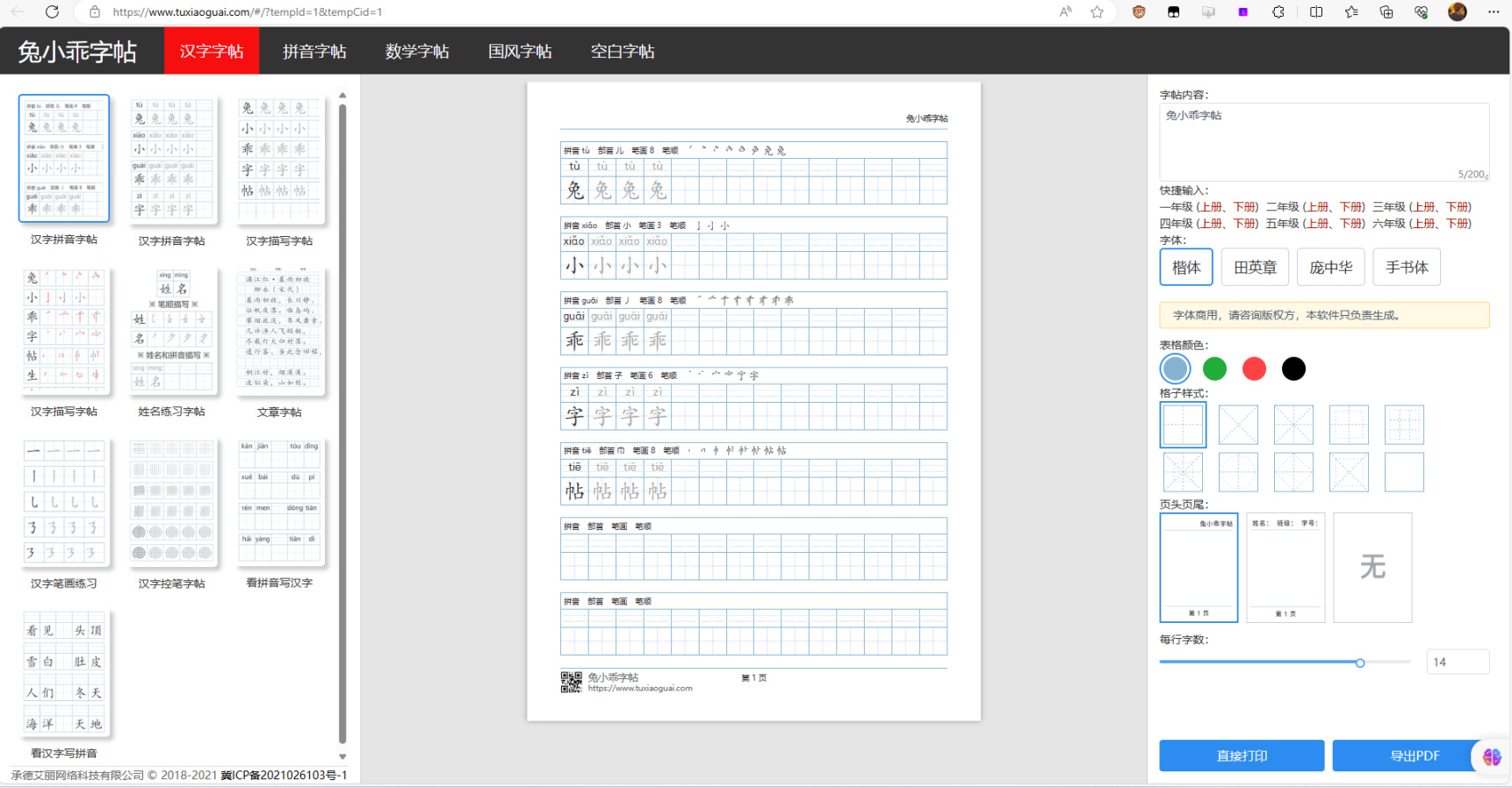一款免费的在线练字字帖,并且可以打印出来。用户可以通过工具进行汉字字帖、拼音字帖、数字字帖、国风字帖和空白字帖等,在练字的不要错过了。