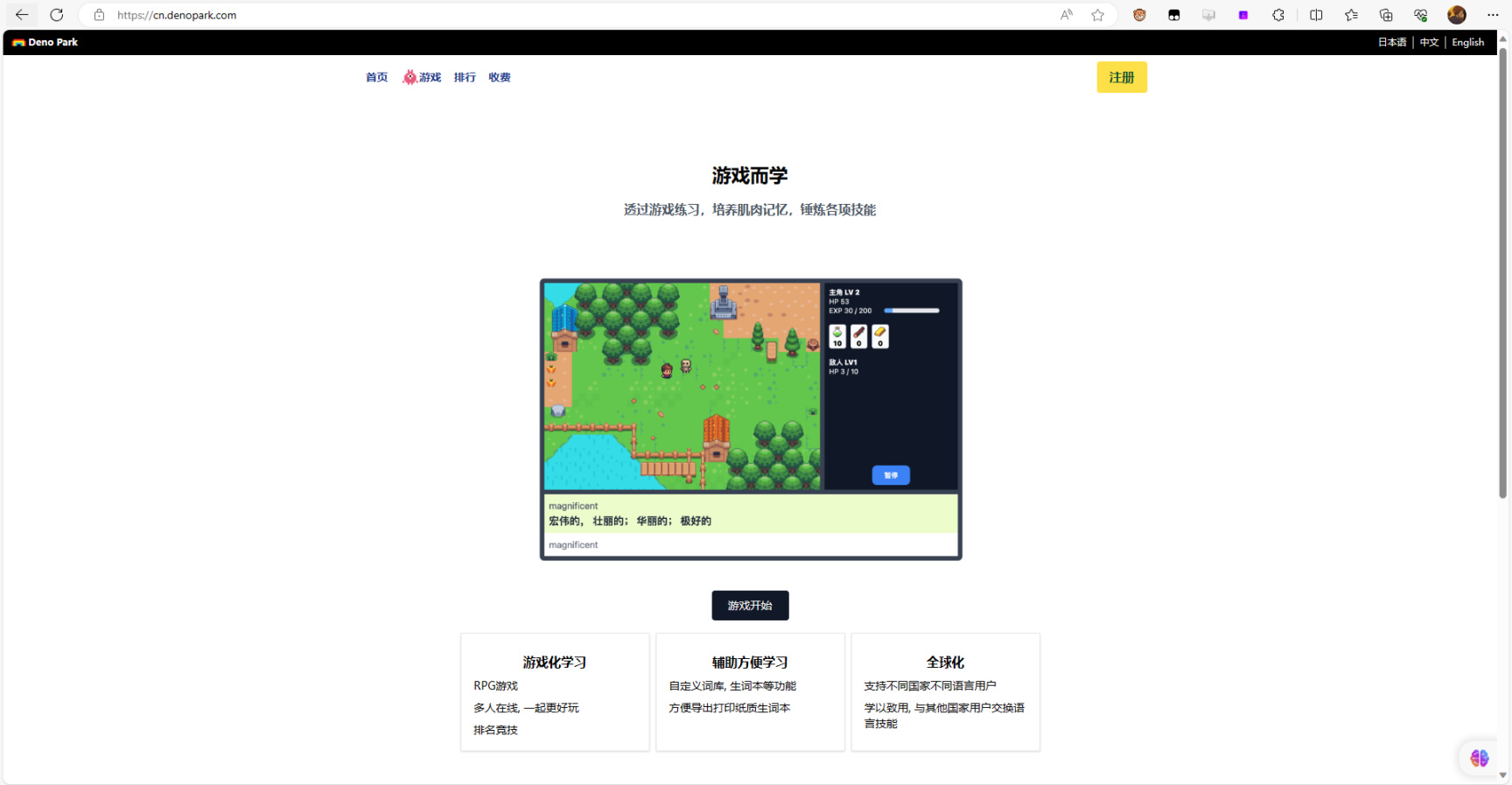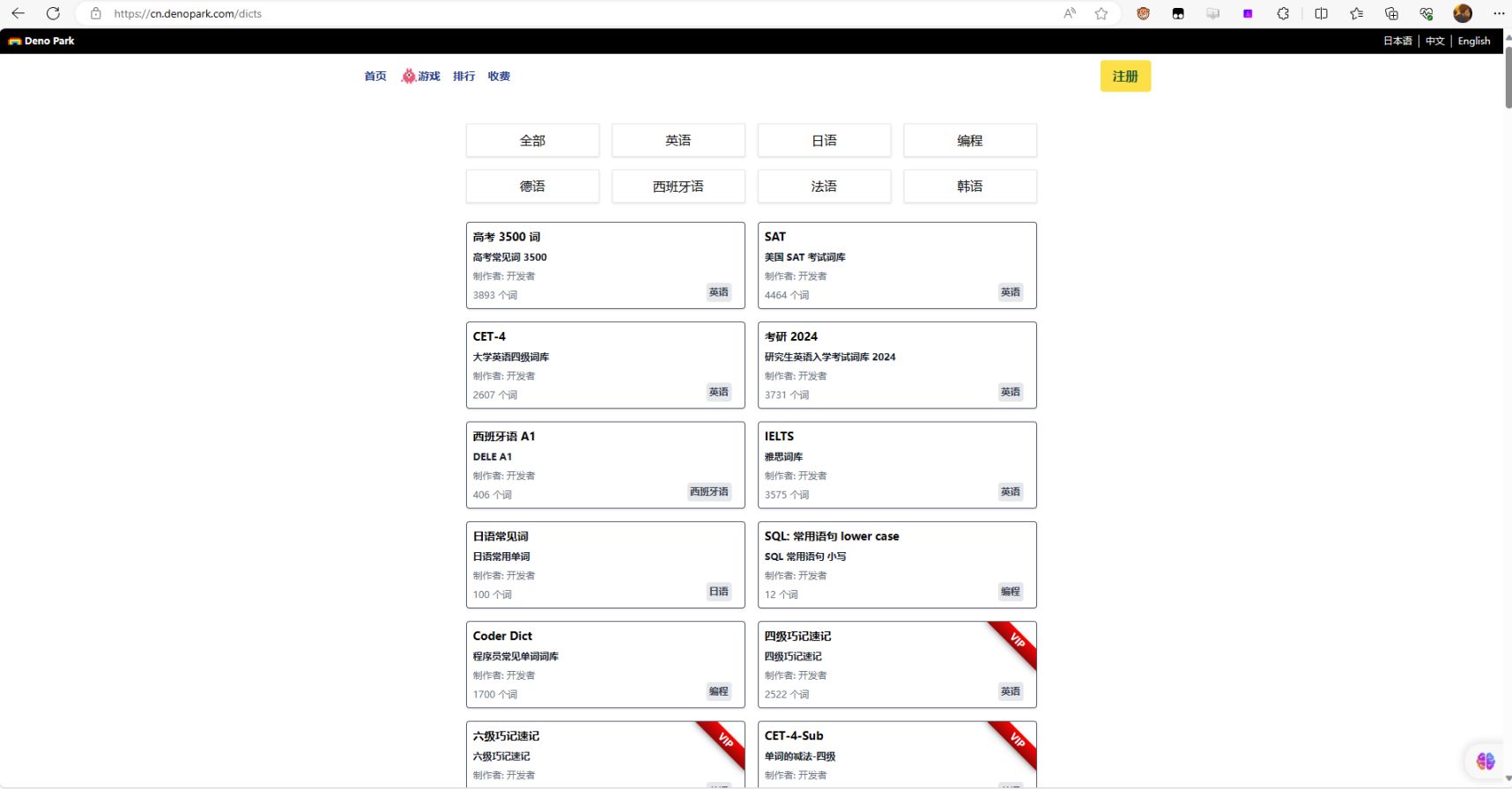 一个在线记单词游戏,利用键盘打字的学习游戏。网站也提供了英语、日语、德语等词库以及