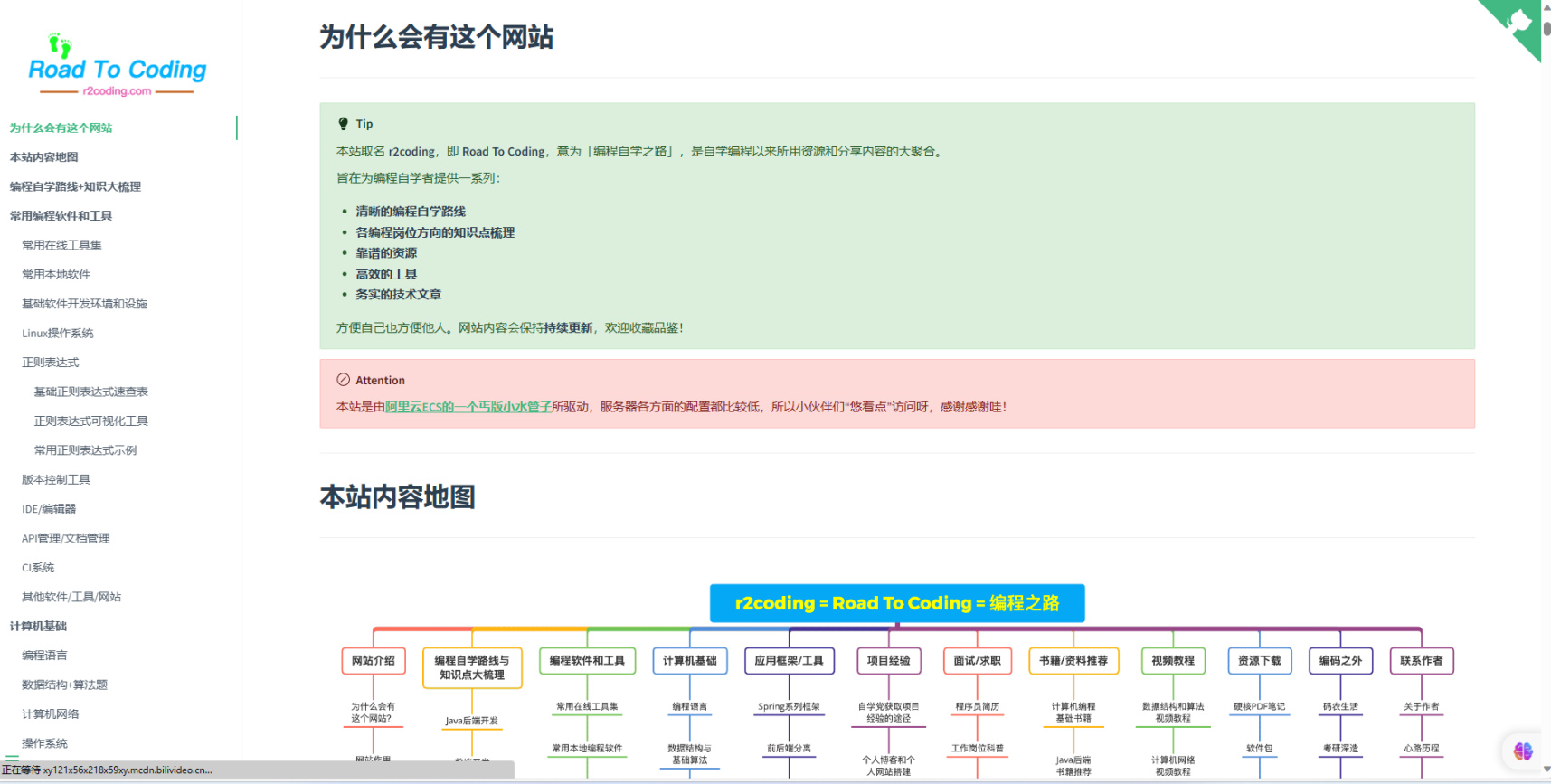 是一个自学编程以来所用的资源分享的大合集。为编程自学者提供了资源,工具,经验线路等,网站内容会保持更新。作者在b站也有账号。