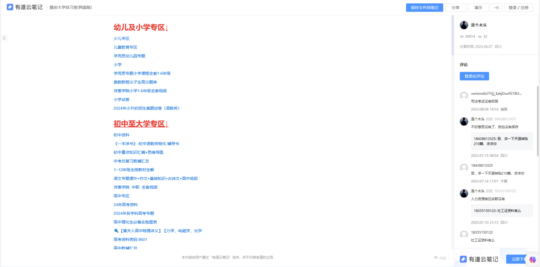 一个网盘学习资料的课程合集,是一份在线有道云笔记文档。文档包括了小学、初中、高中、大学、考研等等课程学习资料,还包括英语、编程等。