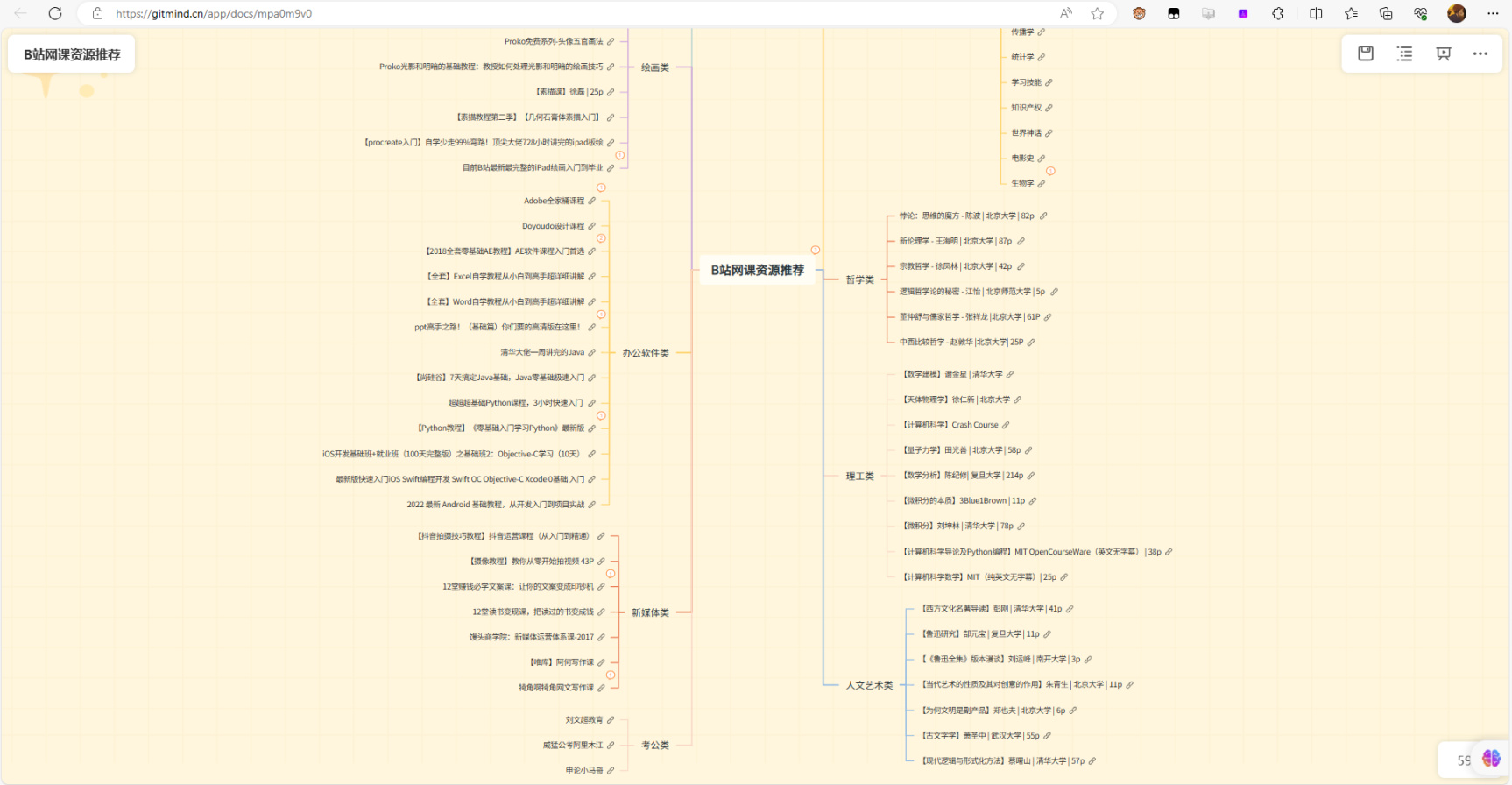 一份网友整理的B站免费课程的合集,并且用了思维导图的方式展示了出来。包含了外语类、绘画类、办公软件类、新媒体类、考公类、人文艺术类、理工类、哲学类以及综合类。