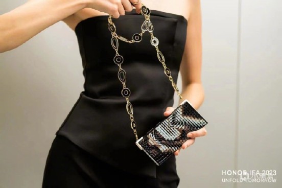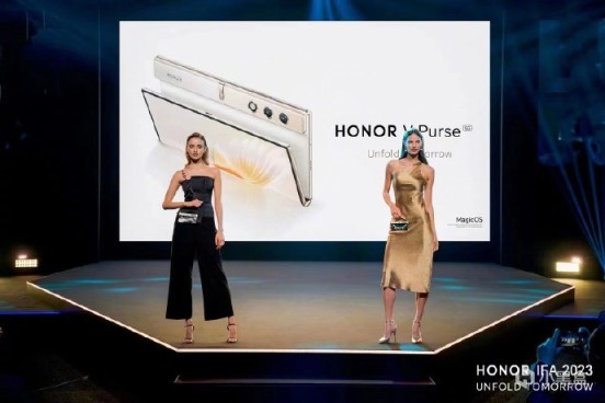 作爲此次IFA展會開幕日首場主題演講代表,中國品牌榮耀,是近三年來唯一一個登上該環節的中國品牌。榮耀帶來的時尚摺疊屏手機榮耀V Purse概念,爲首款外折屏幕的摺疊屏手機。