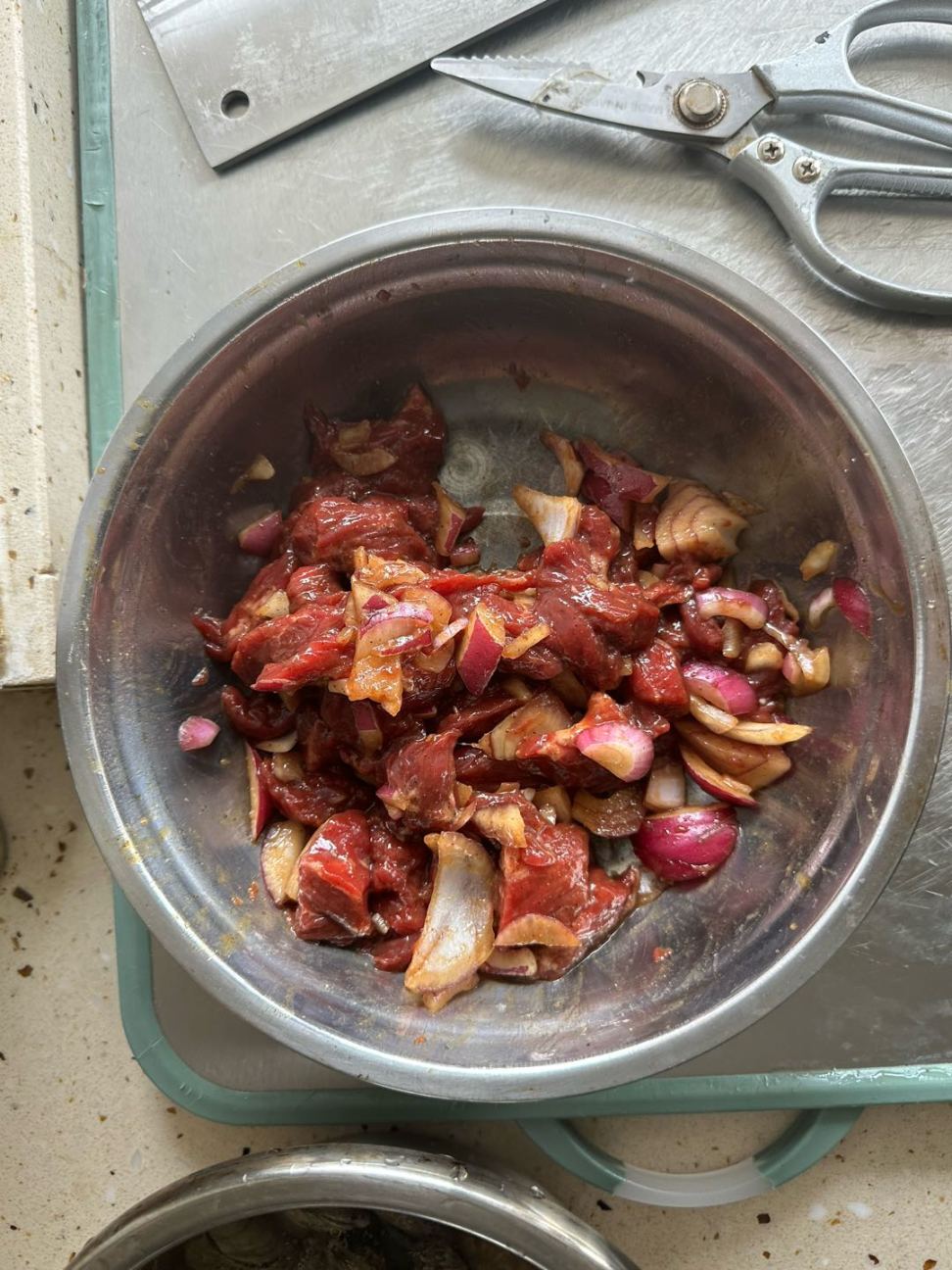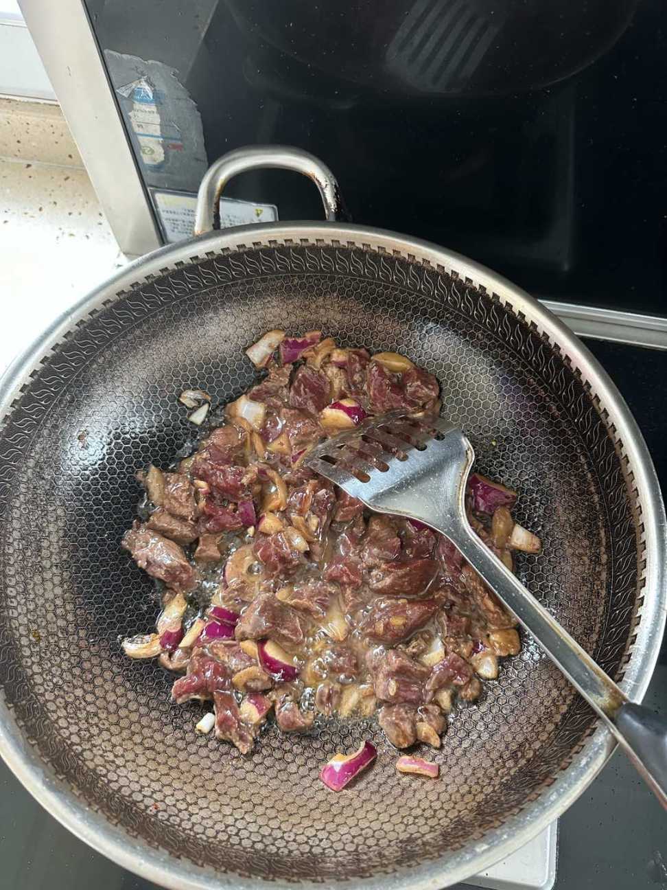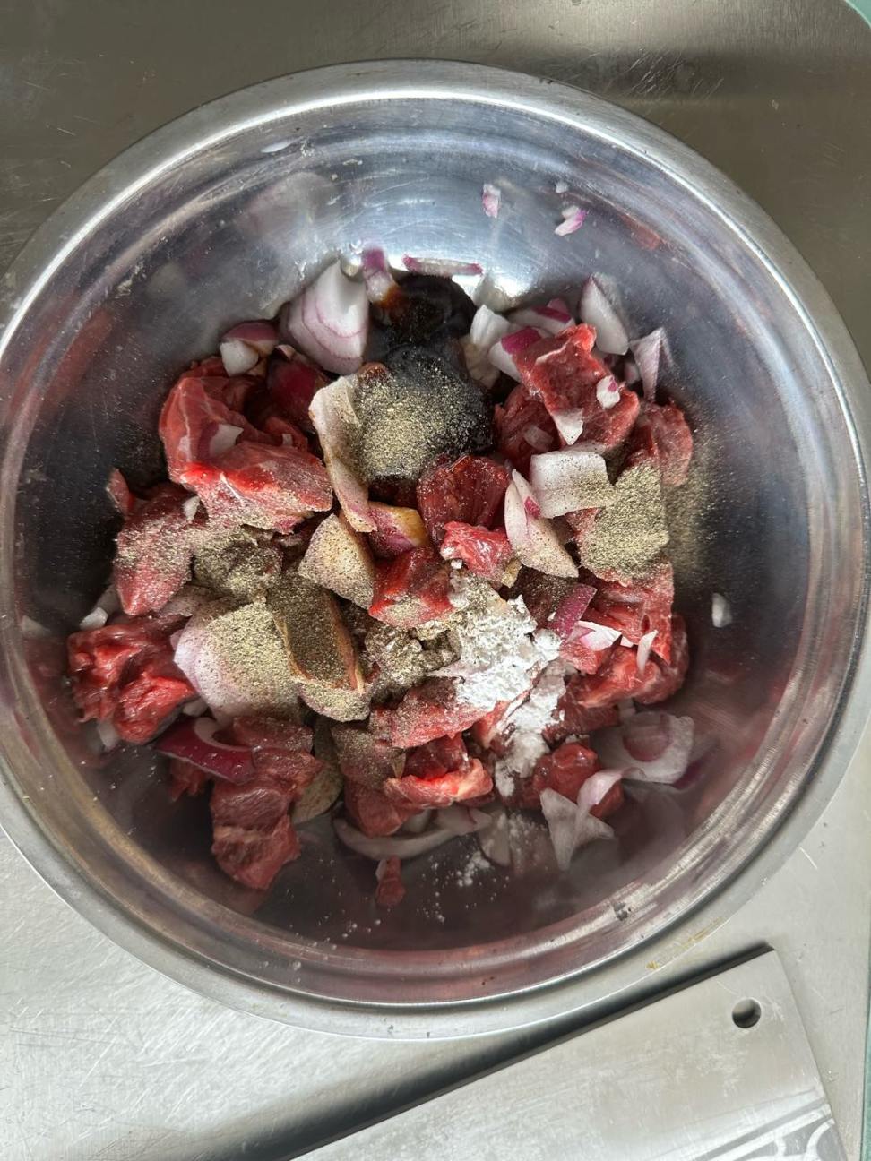 牛里脊肉 (买好咀嚼的),放洋葱,蚝油,生抽,老抽,黑胡椒(所有调料都是一矿泉水盖子,黑胡椒给俺多散点)。腌制中...