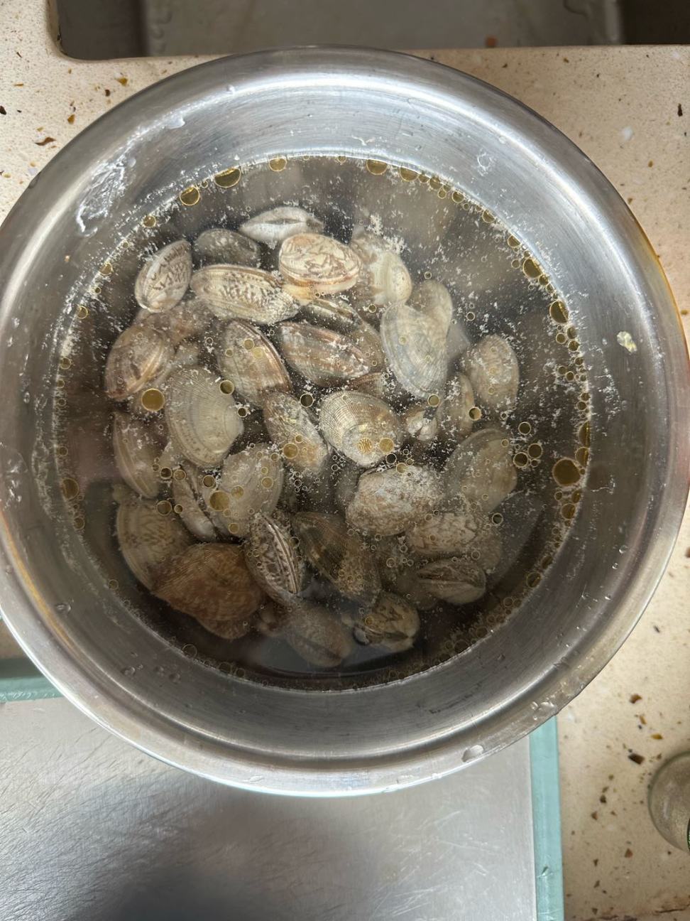 花甲买来,放温水,放盐,放香油,吐沙中...