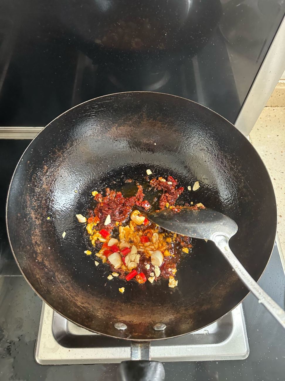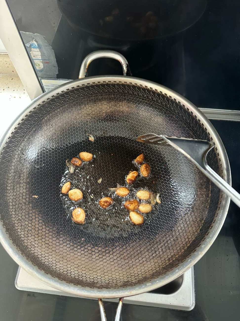 第一口 负责炸蒜到焦黄,注意别糊了,我这里两口锅有点忙不过来,稍微时间有点长了,然后捞出,蒜油留在锅里面