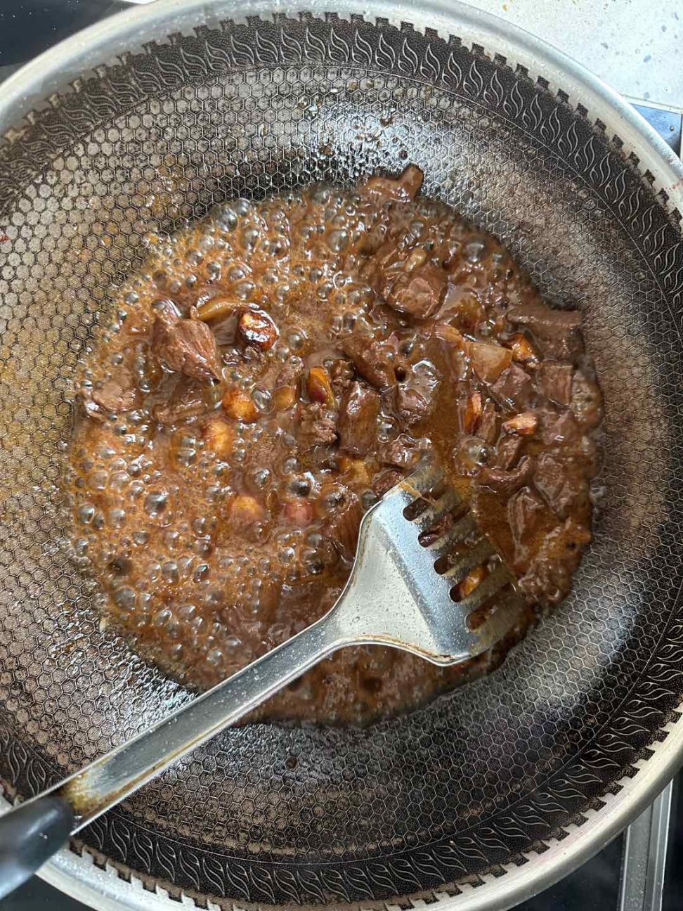 放炸好的蒜,淋入酱汁,大火烧到冒泡,出锅!