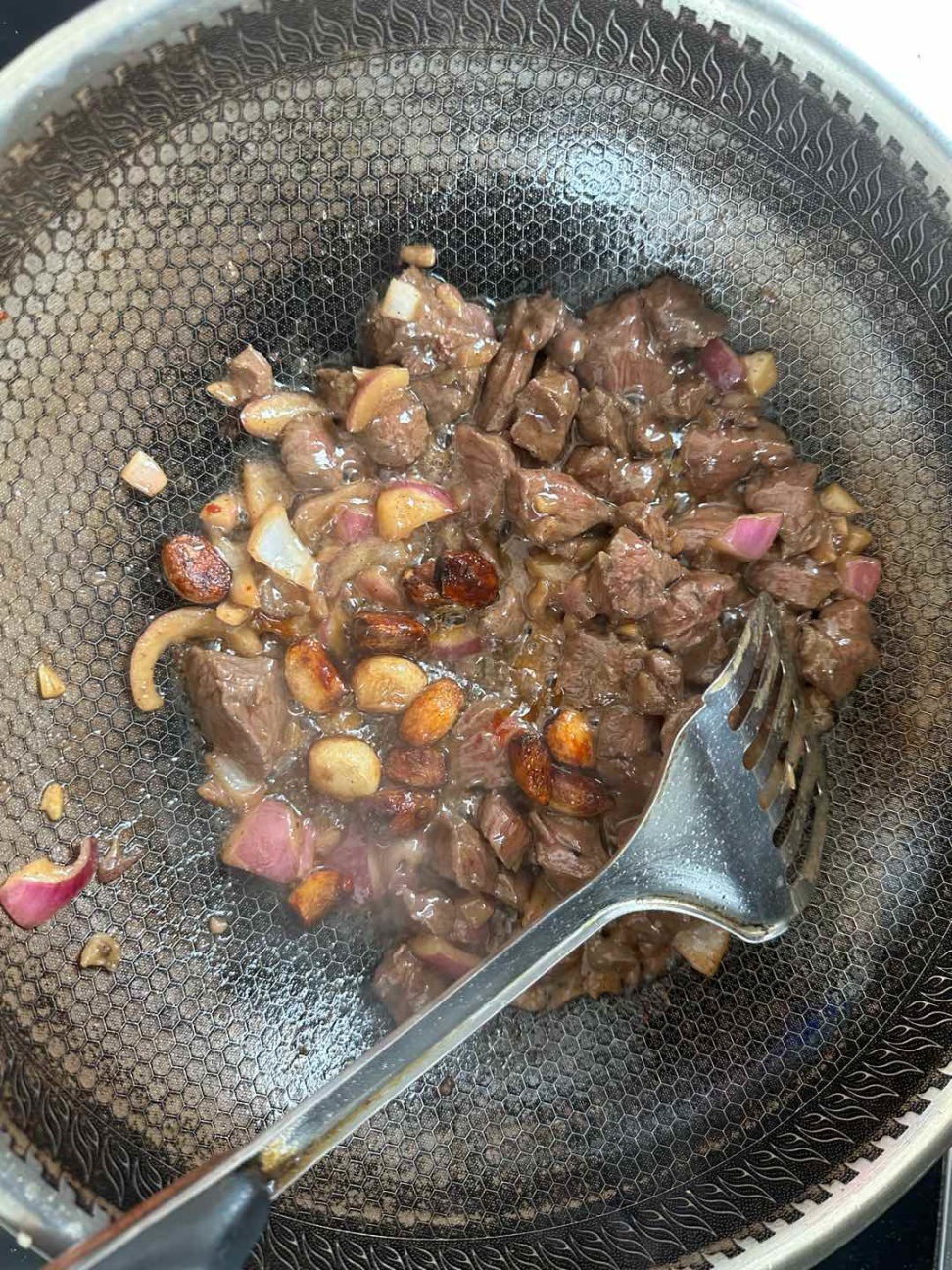 腌制好的牛肉搞到蒜油里面,炒到熟了,可以放一点黄油(我这里没有放哈,因为忘记买了)