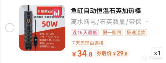 加温棒/温度计:这是热带鱼过冬装备,温度控制在28度左右,选购加温棒是需要咨询客服,不同大小的缸需要不同瓦数的加温棒。
