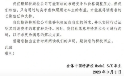 正是因为对特斯拉的期望和信任,使得我们选择了这款优秀的电动汽车。然而这次降价幅度高达20万元,严重影响了我们的车辆保值和内心对特斯拉的热爱。我们认为,特斯拉公司有责任对这一行为给车主带来的损失进行合理的补偿。”