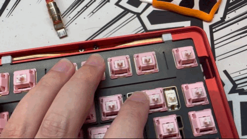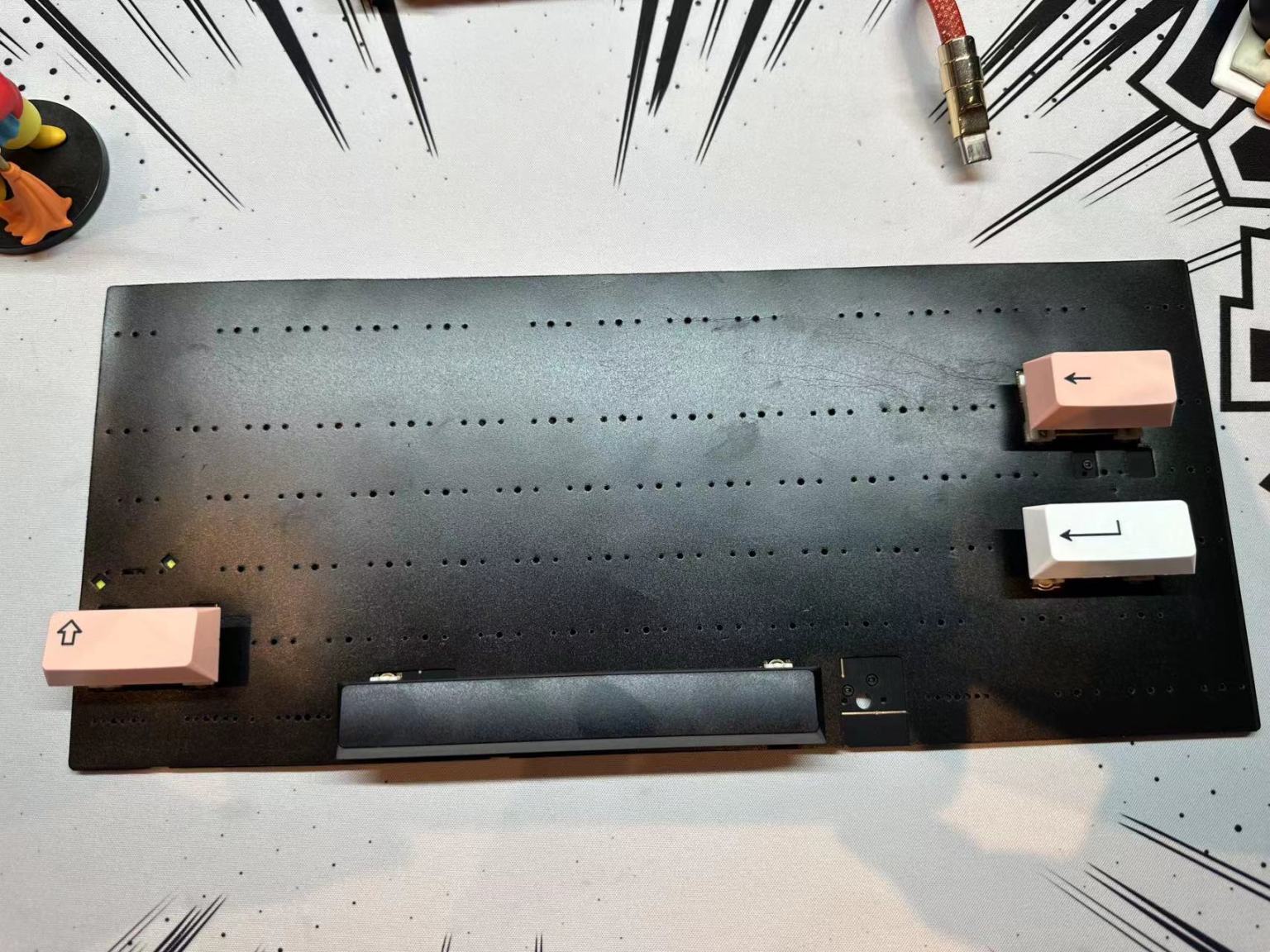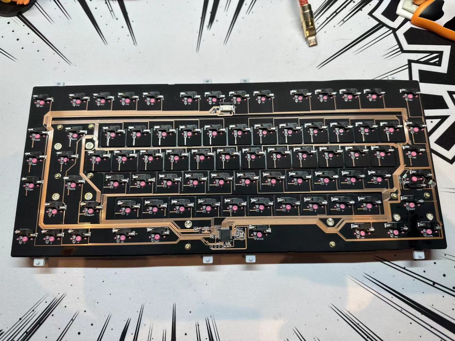 調試的時候,先把軸跟鍵帽暫時安上,然後一隻手按住PCB,另一隻敲擊對應大鍵,來聽是否: