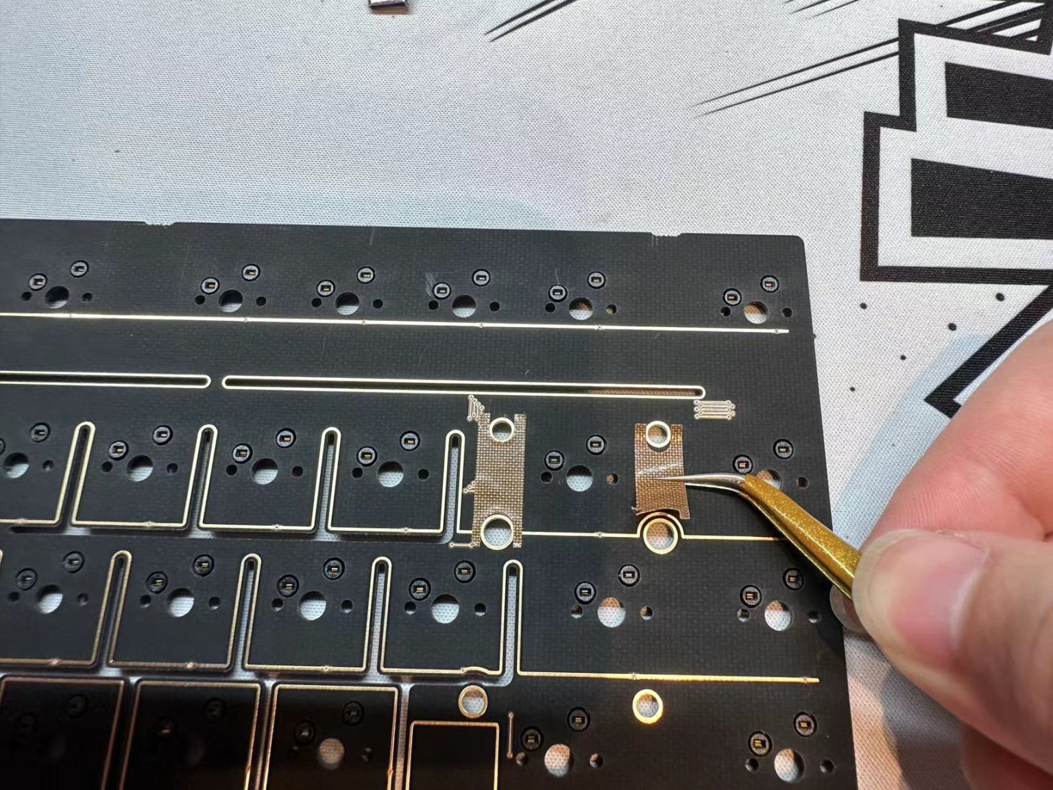 定方版覆蓋上去之後,在四角上各用一顆軸固定一下,然後檢查夾心棉、軸下墊是否對齊。沒有對齊的,用鑷子調整一下