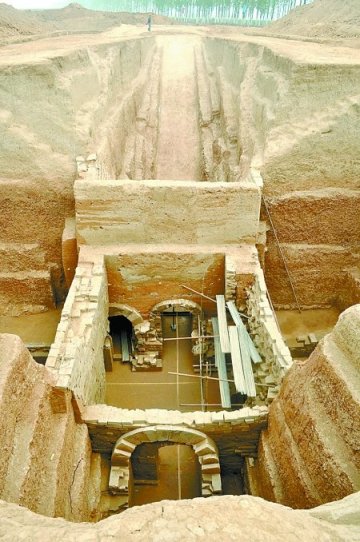 位于邙山陵墓群大汉冢东汉帝陵陵园的东侧,墓葬形制为长斜坡墓道、砖券多室墓,由墓道、甬道、耳室、前室、后室、北侧室、南双侧室等部分组成墓葬东西长50.6米,南北21.1米,深10.5米