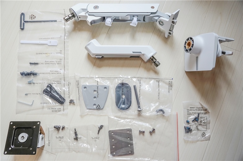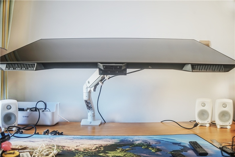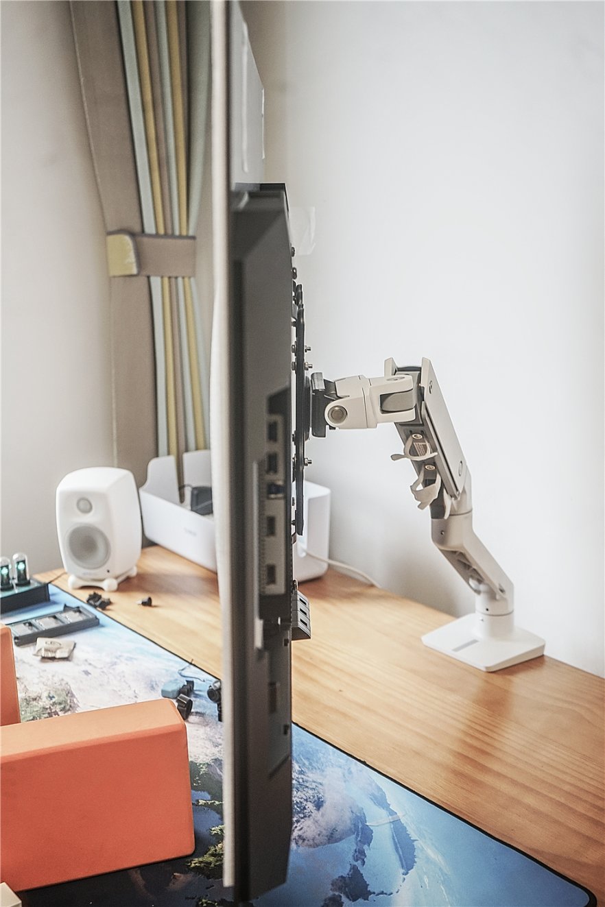 爲了節省桌面空間且更容易規整線材,巨擎48OLED自帶的支架我是不準備用的,所以直接下單擼了愛格升Ergotron45-475-216。但是哈,一口氣把這個抬上桌子非常考驗臂力,不是說舉不起來,而是要注意別在OLED顯示面板上用太大力,而且還要對準愛格升475的固定位,所以我是和女王一起抬着對準安裝的。