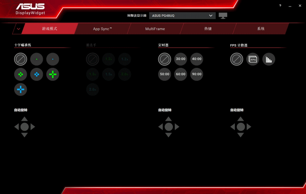 DisplayWidget軟件的界面動圖,遊戲模式下直接可以選擇添加十字瞄準線、定時器和FPS計數器;APP Sync裏可以指定軟件切換顯示模式,對多種喜歡玩FPS和RPG等多類型遊戲的用戶非常友好;MultiFrame,;熱鍵則是選擇切換GameVisual和陰影增強等不同設置;系統裏面都是具體選項,建議認真看,輸入選擇和技術支持以及檢查更新(檢查更新有必要)都在這裏。