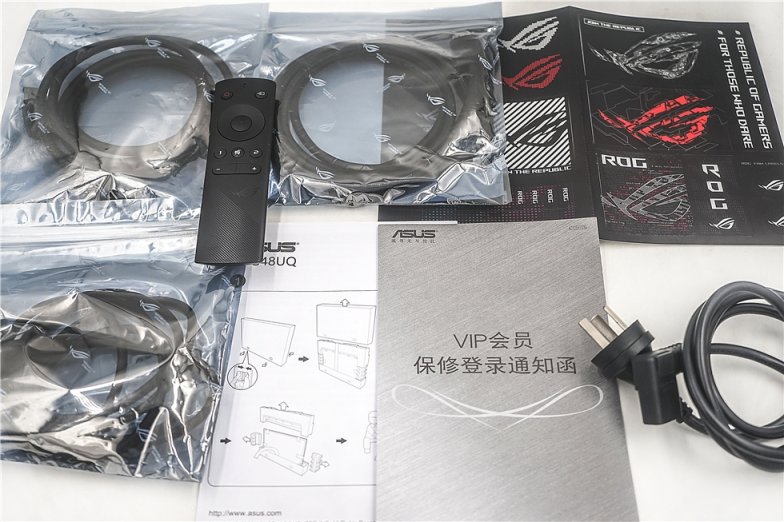配件全家福,包括色彩預校準報告、DP線、HDMI線、電源線、USB3.0線(更新固件要用到,千萬別不當回事)、遙控器、保修卡、安裝說明、貼紙。