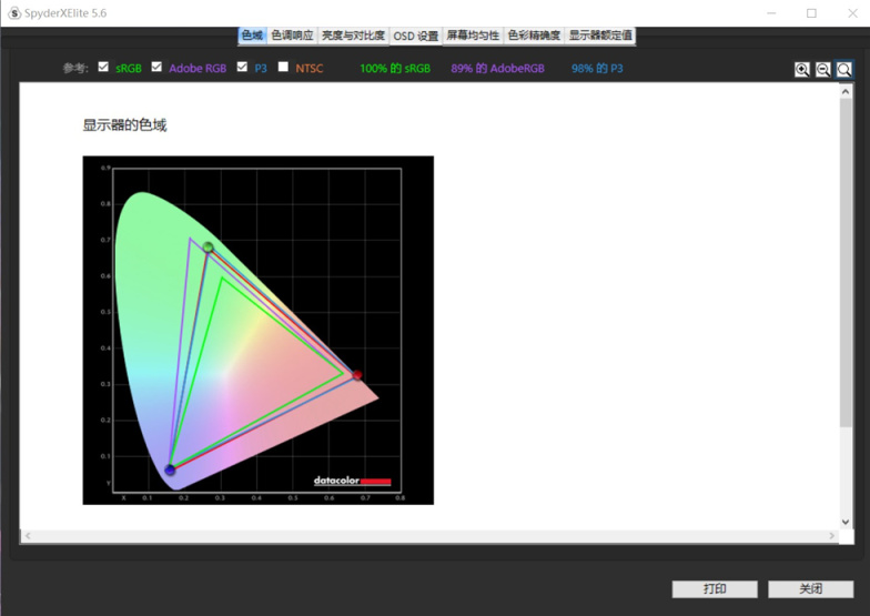 華碩巨擎48OLED擁有133%的sRGB色域覆蓋,98%的DCI-P3影院級別的色域覆蓋,軟件測試結果的100%sRGB色域覆蓋和標稱133%的sRGB色域覆蓋有誤差,但是P3毫無問題。原本還計劃測試下色彩精準,看了出廠預校準△E<2,華碩作爲大廠,用過的顯示器只要帶參數的都沒問題,所以就不測了。