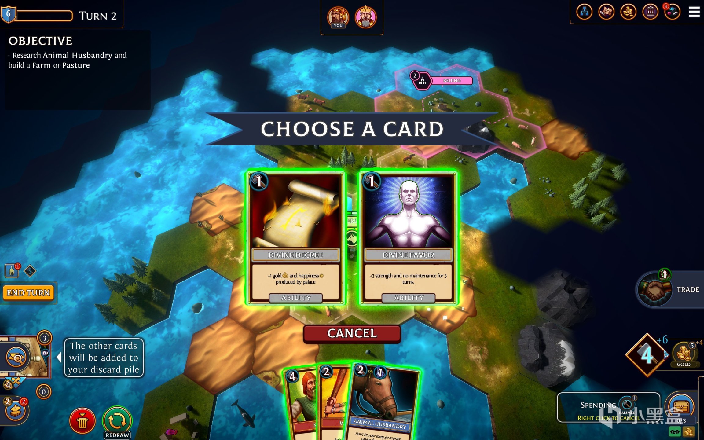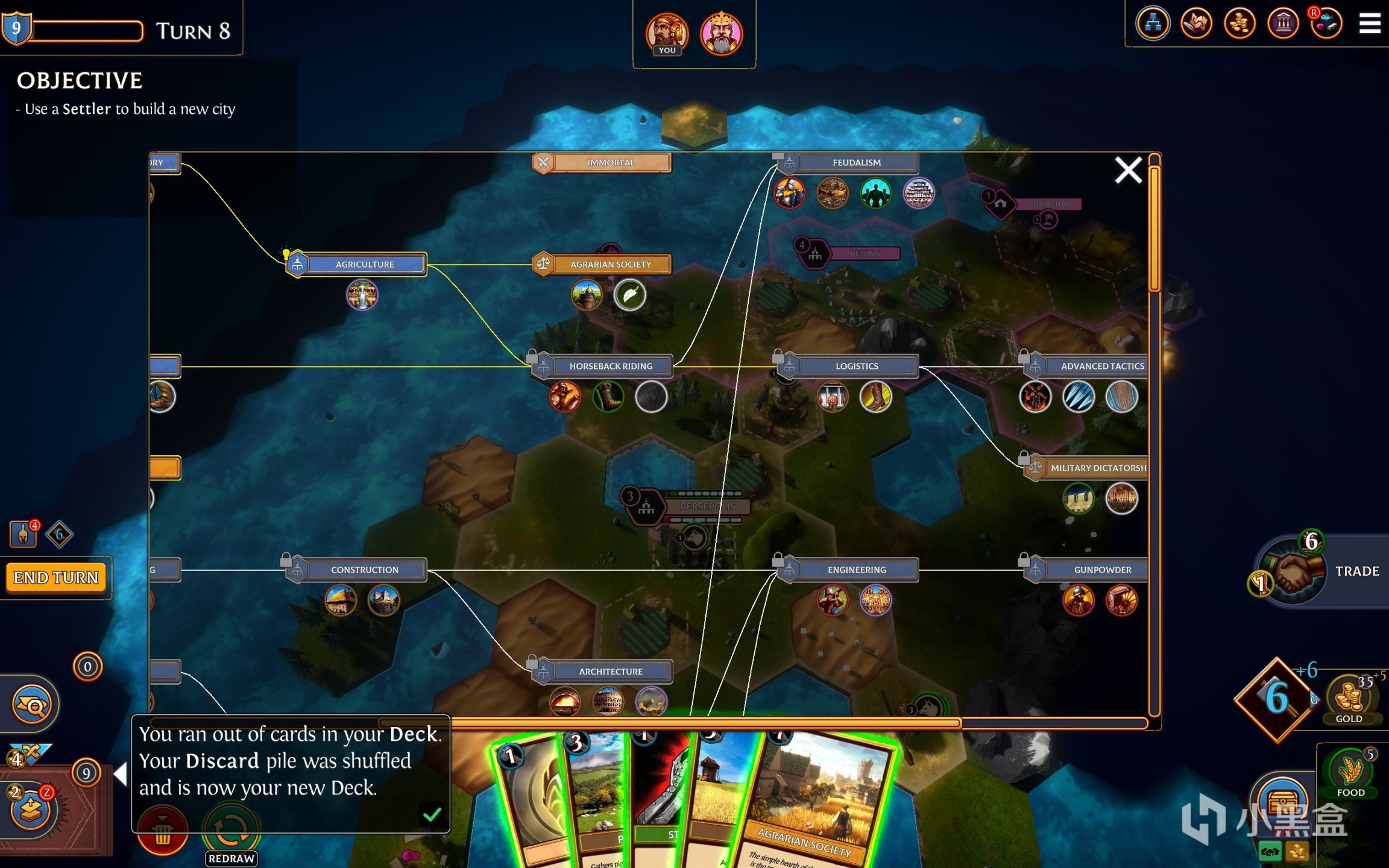 而游戏中的卡牌除了上面所提到的建筑卡之外,还有着文明专属能力卡、一些土地资源提升卡(感觉就是建筑卡)、给士兵加buff的卡、以及科技卡和士兵卡。每个卡牌都需要消耗一定的行动点,但是部分卡牌可消耗除了行动点之外的资源来进行使用,科技卡的融入无疑是一个十分大胆的创意,将科技树的点数解锁设计变成了资源和行动力消耗的设计。