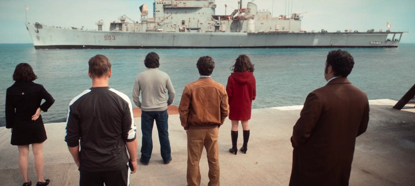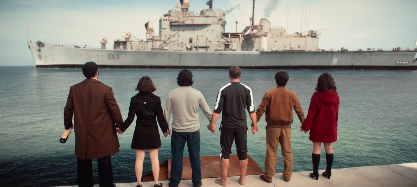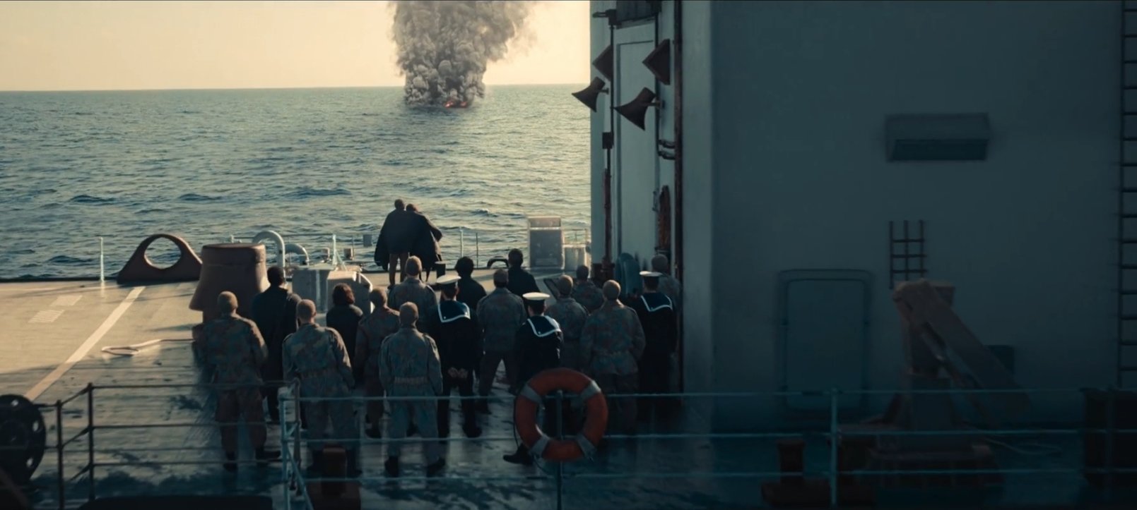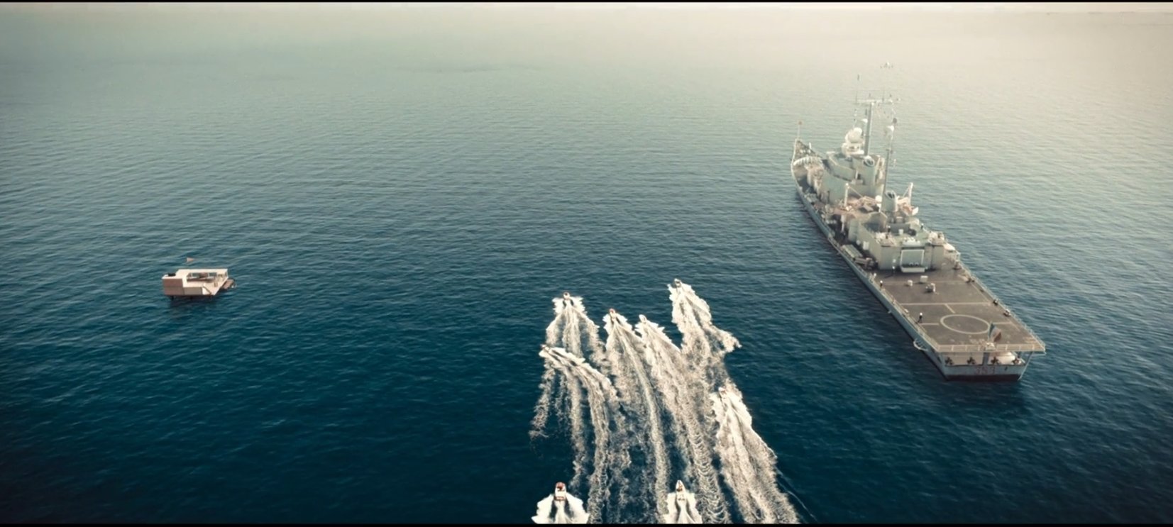 军舰多次轰炸小岛周边想要吓退这群人,尽管他们一次次被吓的松手,被冲击波震飞,他们还是一次次回到平台前拉起手,用高傲的灵魂表示鄙夷。