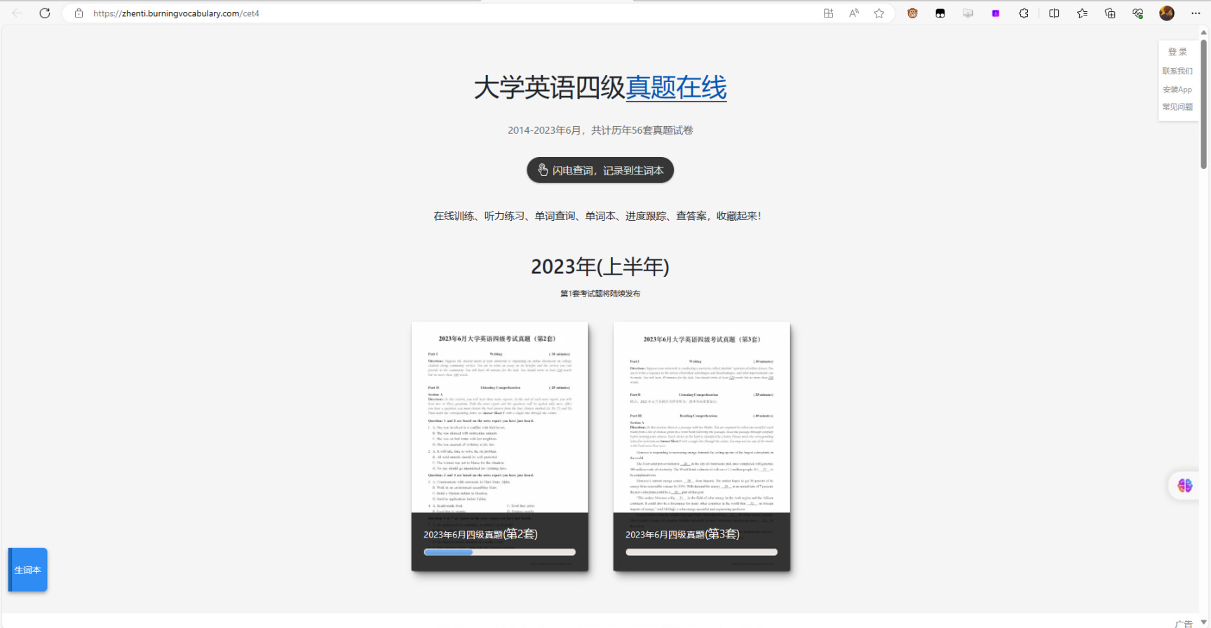 擁有2014-2023年6月真題試卷,在線音頻聽力,免費下載PDF文件,點擊單詞就可以查詞,在線訓練真題、聽力、答案、查詞、單詞本、練習進度(高級版有收費,9.9半年)