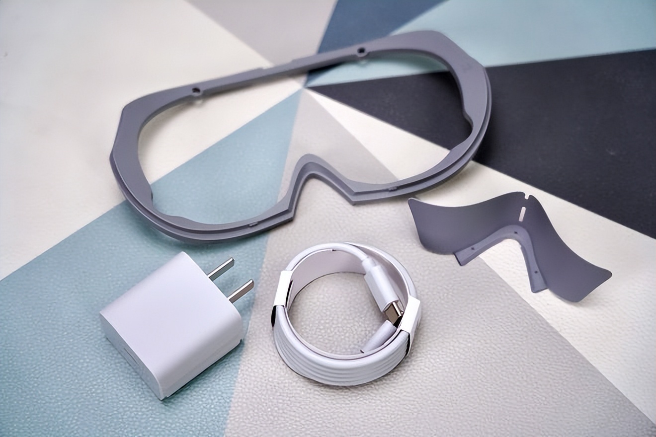 除 PICO 4 VR 一體機和2個6DoF手柄外,配件包含:目鏡框架加厚配件、軟性硅膠遮光鼻託、USB Type-C充電線以及20W功率USB-C充電頭。