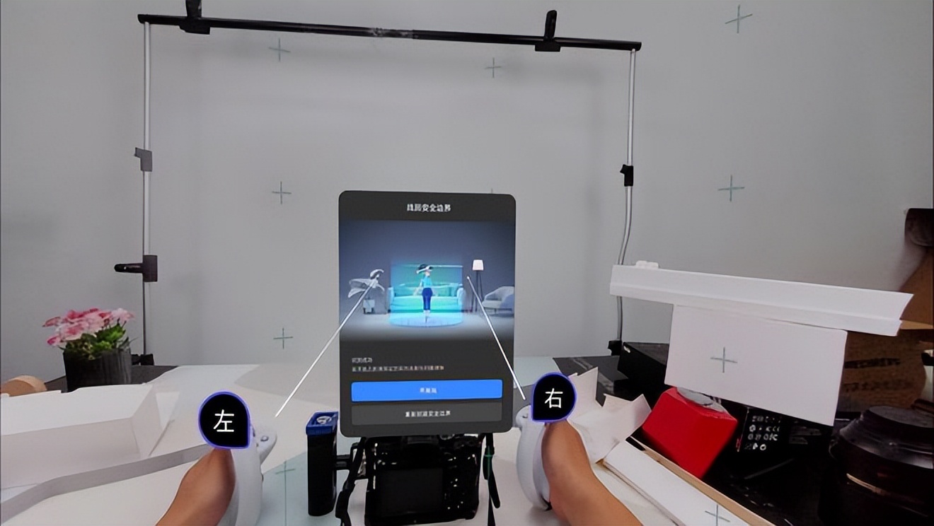 初次開機將提示設置安全區範圍,有3種預設範圍大小和自定義區域可供選擇。當操作中身體接近安全區,眼前會提示網格,播放攝像頭拍攝的實景,保護使用者安全。PICO 4 的前置攝像頭採用1600萬像素索尼彩色攝像頭,因此展現出全綵透視的現實世界,相信在不久將來還能利用其實現MR功能。