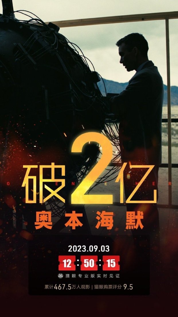 根據第三方數據平臺貓眼專業版的數據顯示:由諾蘭導演的劇情類電影《奧本海默》在上映5天后,中國內地票房突破2億元!