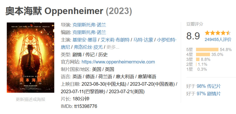 《奧本海默》的IMAX版在視效和音效上十分出色,只是在劇情的有一定的理解門檻,但是並不影響觀衆進入電影院去欣賞這部電影!值得一看!