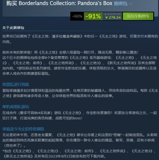 無主之地:潘多拉魔盒合集】現已發售,常駐商店,現一折發售,內容包含如下圖