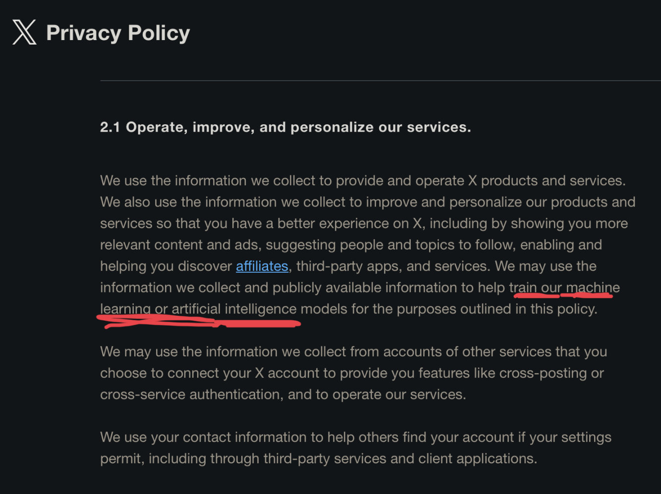 近日,马斯克旗下社交平台X,更新了隐私条款,“我们可能会使用收集到的信息以及公开信息,来训练我们的机器学习算法、AI模型等。”