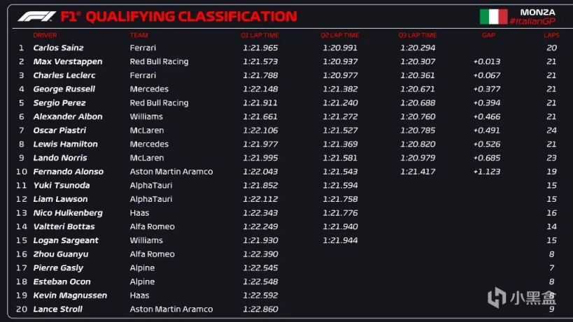 Q2車手強制性搭載中性胎,維斯塔潘以0.04秒的微弱優勢拿下Q2第一,角田裕毅、勞森、霍肯伯格和薩金特被淘汰。Q3強制軟胎,第一輪飛行圈中,維斯塔潘出現失誤,在5號彎軋上砂石區,最終塞恩斯以1:20.294的圈速絕殺塔炮,幫助法拉利奪得今年的第三杆,維斯塔潘第二,勒克萊爾第三,拉塞爾和佩雷茲分列四五,阿爾本第六!