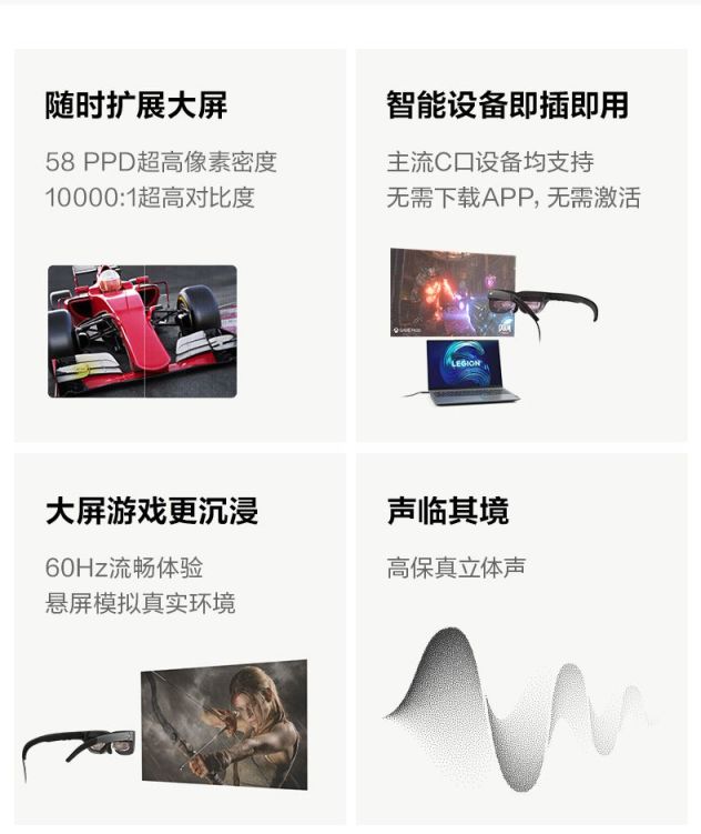 采用微形OLED显示技术,有60hz的刷新率,兼容市面上的主流设备,安卓7,Windows系统以及配备全功能 USB-C 的 mac OS 8 设备。