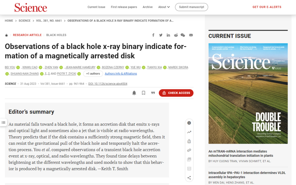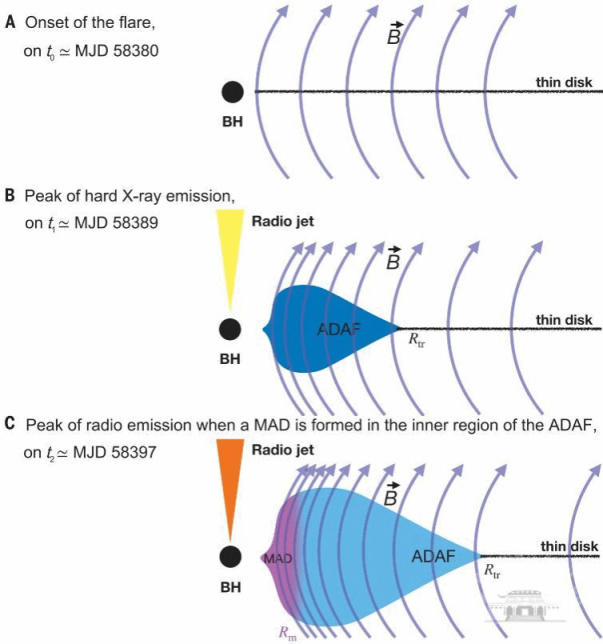 中外科研合作團隊最新研究發現黑洞周圍磁囚禁吸積盤形成過程的直接觀測證據,破解了磁囚禁盤如何形成之謎,相關成果已於 9 月 1 日以長文形式發表在《科學》上。