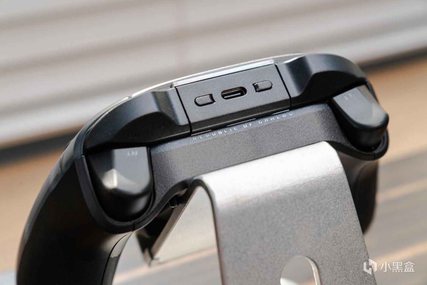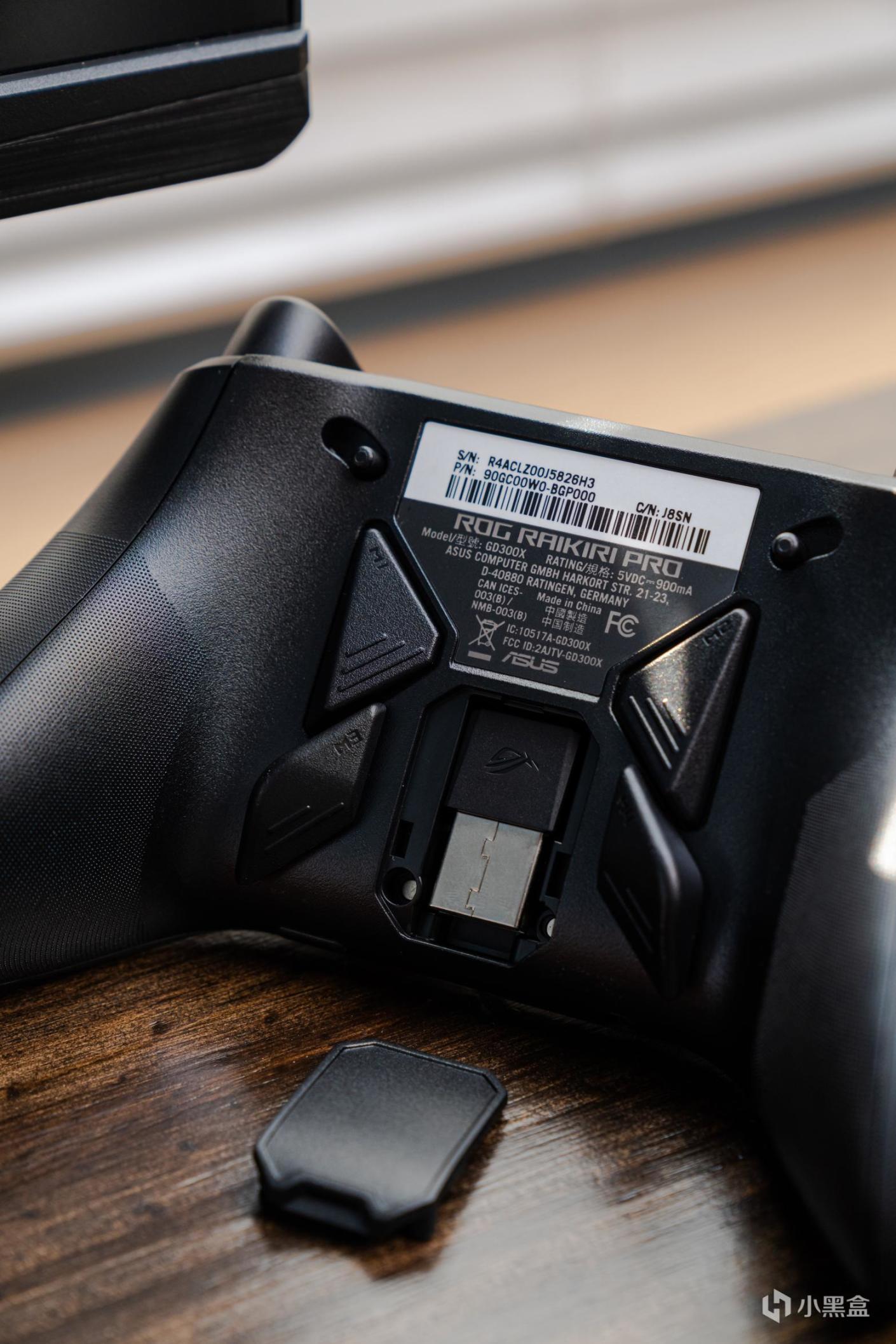 ROG雷切Pro无线游戏手柄尾部有一个3.5mm的耳机接口,手柄搭载的独立ESS DAC芯片可带来更好的音效体验。耳机孔另一侧是用于开启和关闭聊天的静音按钮,这个按钮同时也充当蓝牙配对键。手柄背部还有专门的2.4GHz接收器收纳仓,收纳仓采用磁吸式舱盖,提高了便携性。随机附送了一条3米长的Type-C连接线,方便在客厅里面连接Xbox游戏机使用。
