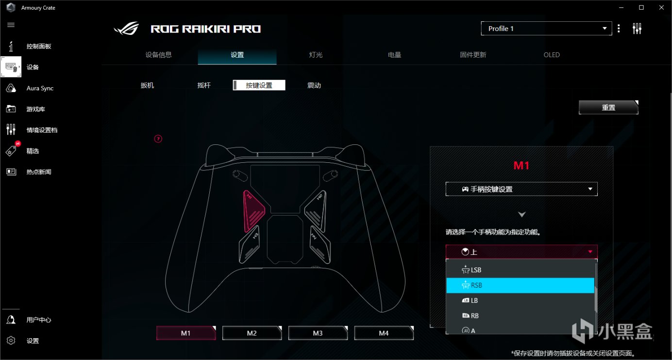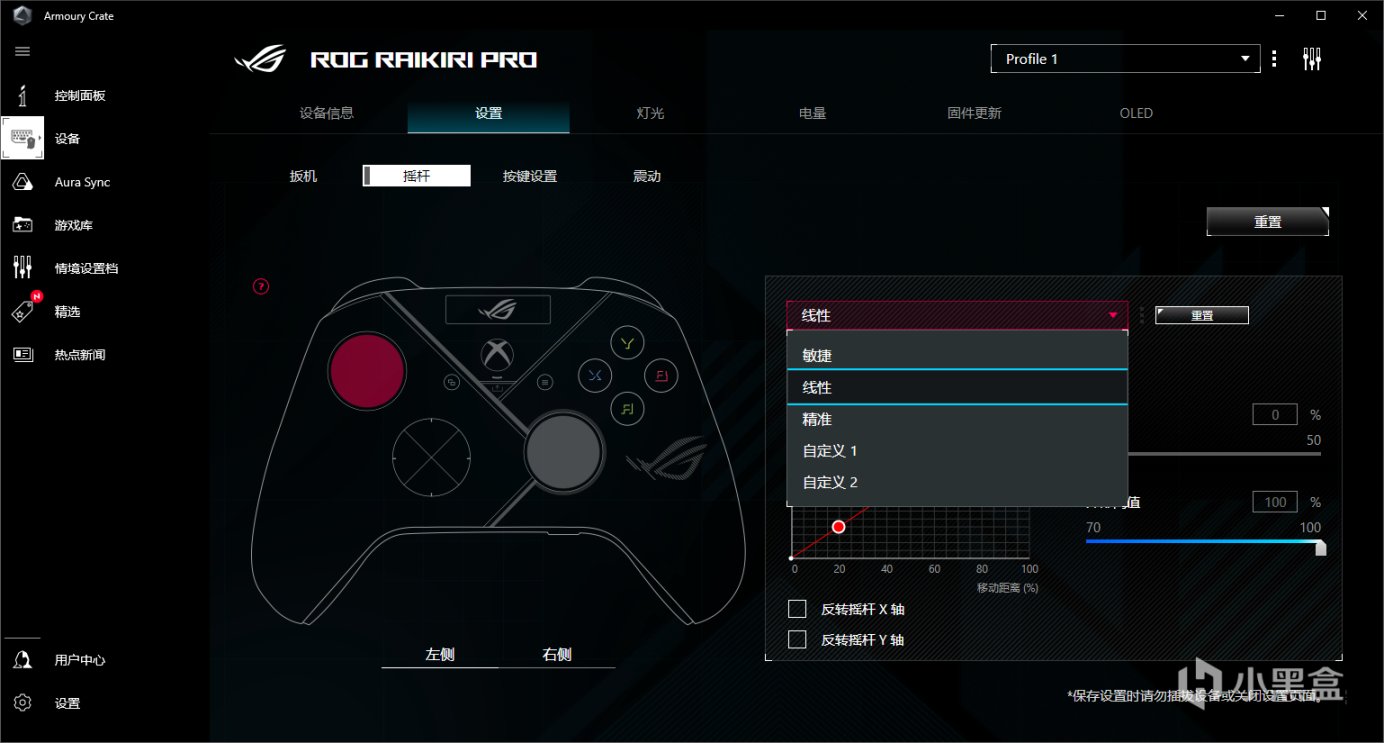 通过USB有线连接电脑后,奥创控制中心可以识别出ROG雷切Pro无线游戏手柄。在设置界面,支持对手柄的左右扳机触发键程、摇杆响应曲线、背键映射进行调整。其中背键只能映射到手柄的其他按键(包括快速调节摇杆精度功能),不支持组合按键和宏功能,这在一定程度限制了背键的使用场景。手柄还搭载扳机震动功能,支持单独设置扳机和底部的4个震动马达的强度。