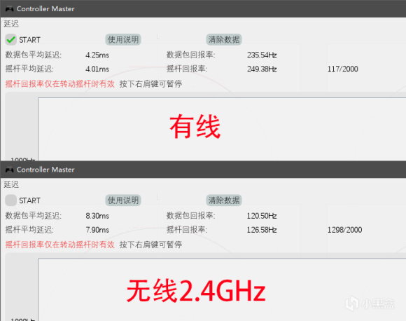 为了测试ROG雷切Pro无线游戏手柄的性能,我们使用Controller Master软件重点考察了手柄的摇杆回报率和延迟情况。在有线连接模式下,手柄的摇杆回报率可以达到250MHz,平均延迟为4.08ms。而在2.4GHz无线连接模式下,手柄的摇杆回报率在125MHz左右,平均延迟在8ms以内。在目前手柄回报率“大跃进”的趋势下,这个表现其实不算亮眼,高回报率在理论上可以带来更好的响应和精准度,但手柄本身优化其实同样重要,毕竟XSX手柄的回报率也仅125MHz。