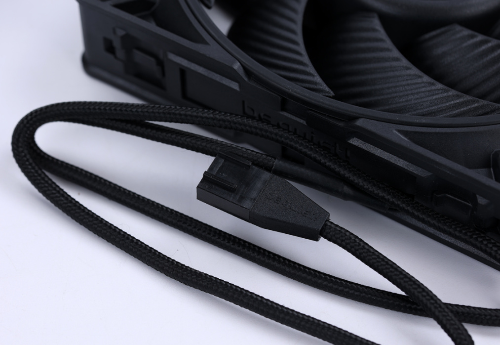 風扇標配50cm長的供電線,插頭爲4Pin PWM接口,可通過主板設置改變風扇轉速。防火編織網材質的風扇外皮也可以充分保護線材本體不受損傷;