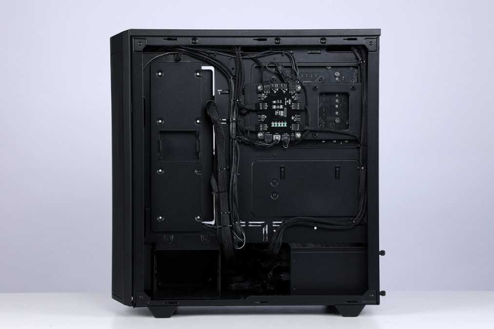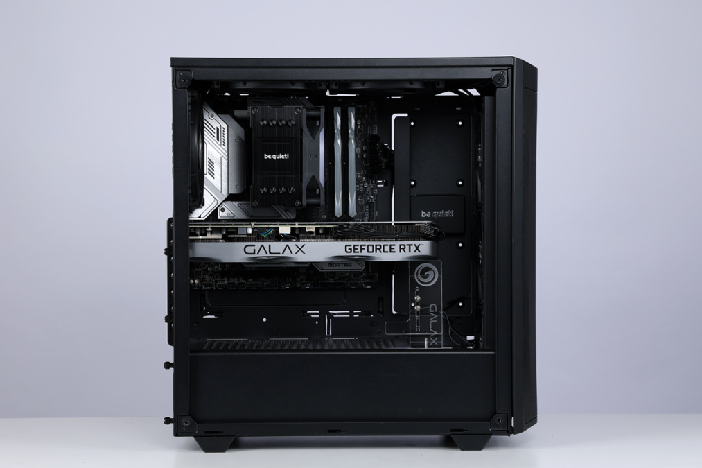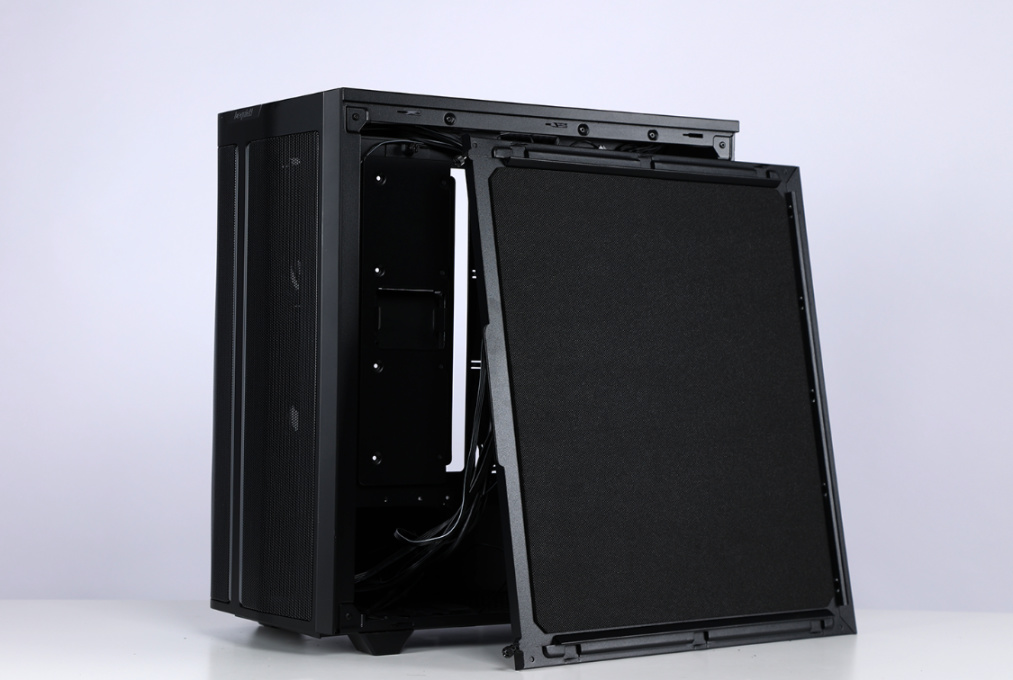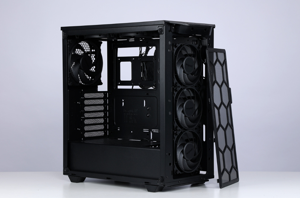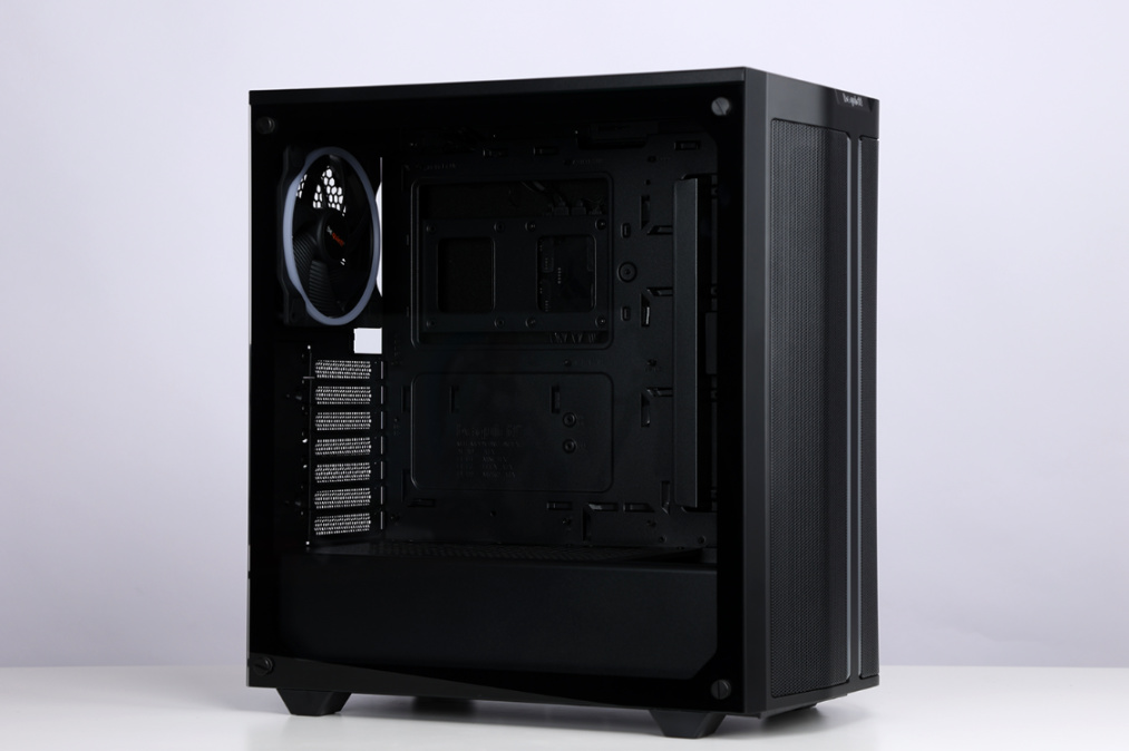 當初裝機也是奔着靜音/低調去的,所以機箱也是選擇的德商德靜界PURE BASE 500 FX 黑色中塔機箱。機箱三圍450mm*232mm*443mm,純黑配色,主打就是一個低調。機箱左側板是一塊暗化處理的鋼化玻璃,右側板則採用金屬材質,內附整塊黑色靜音泡棉,可以有效吸收一定噪音。