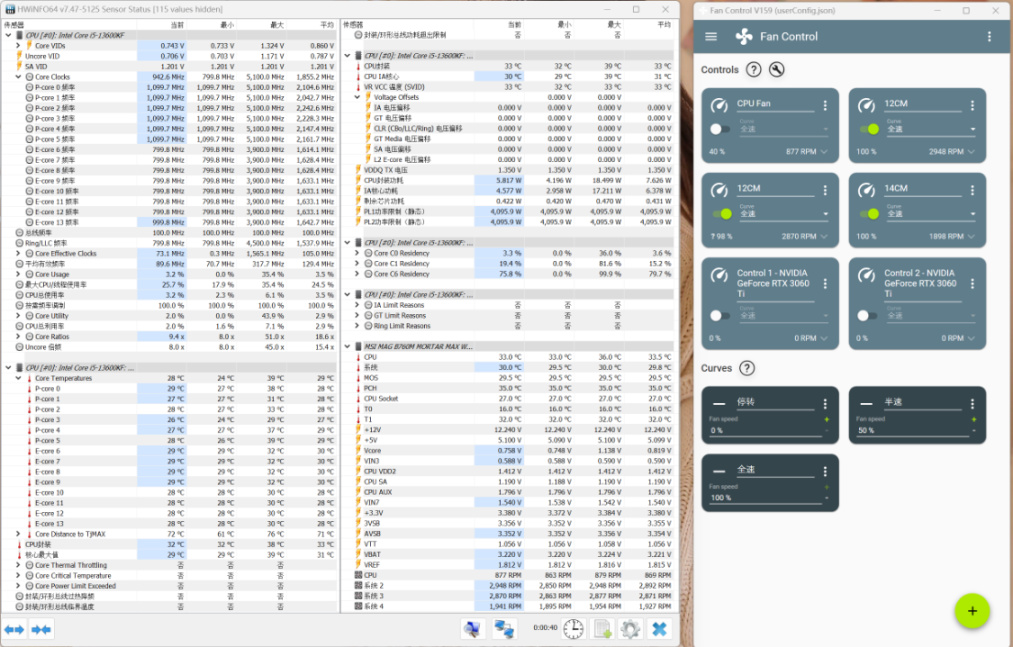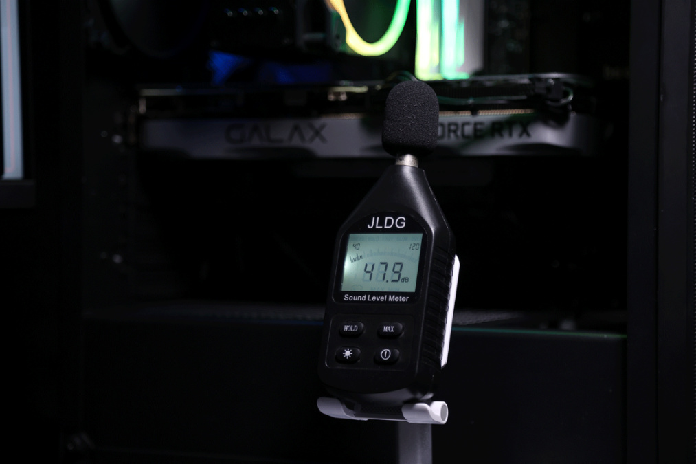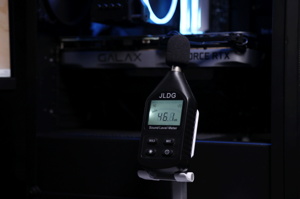 手動將機箱內部風扇全部手動鎖定爲50%轉速時,機箱附近的噪音值爲46.1dB(A)左右;
