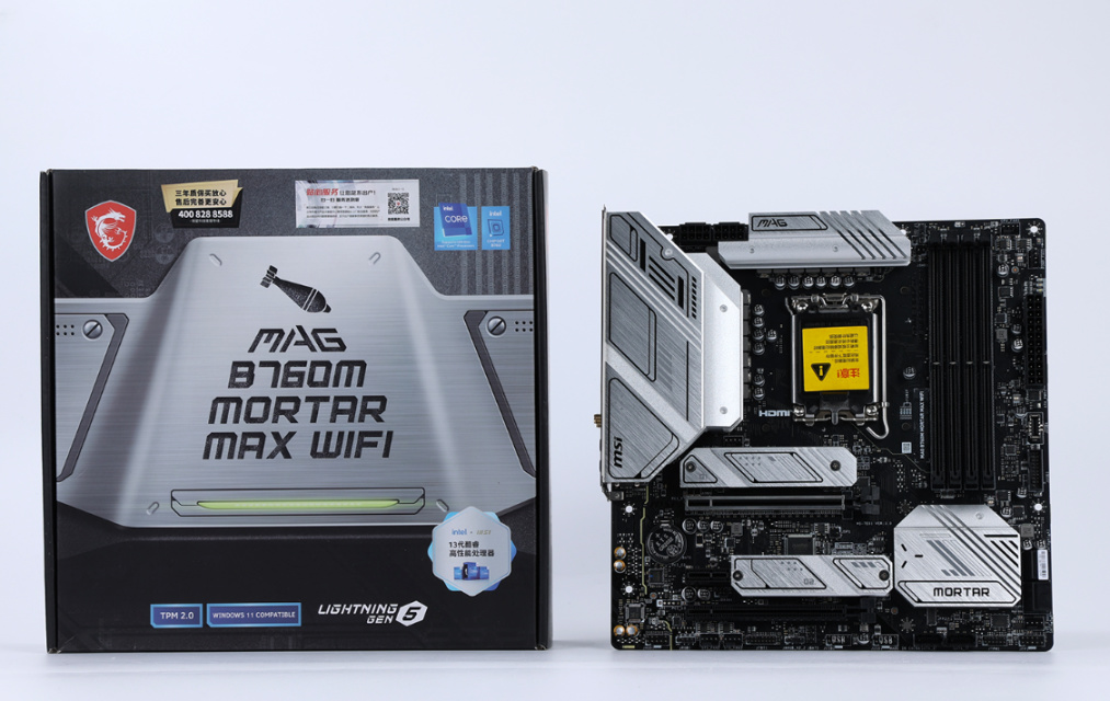 主板方面跟大多數玩家一樣,選擇的是能跑滿136KF睿頻的B760主板,不過出顏值考量,選中的是微星的B760M 迫擊炮MAX主板。黑色PCB板上,有大面積高顏值銀色金屬散熱裝甲覆蓋,整體顏值拉滿。同時,12+1+1相DrMOS智能供電設計,搭配上雙8Pin外接CPU供電,也是絕對豪華的配置。