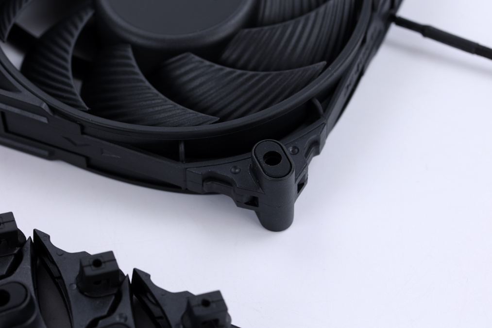 風扇提供了3種不同的替換支架,除了已經預裝在風扇上的水冷防風擾流支架以外,還分別附贈了減震橡膠支架和常規的硬塑料螺絲支架。且均支持免工具拆裝,日常更換方便,可玩性也不錯。同時,配件包裝內還附贈了4顆風扇螺絲、4個減震墊圈以及4個塑料插栓;