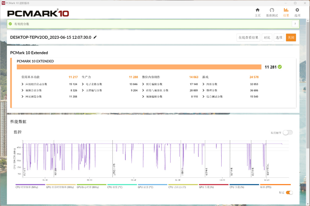PC Mark Extended整機測試,整機得分11281分,常用基本功能得分11217分,生產力得分11288分,數爲內容創作得分14063分,遊戲得分24578分;