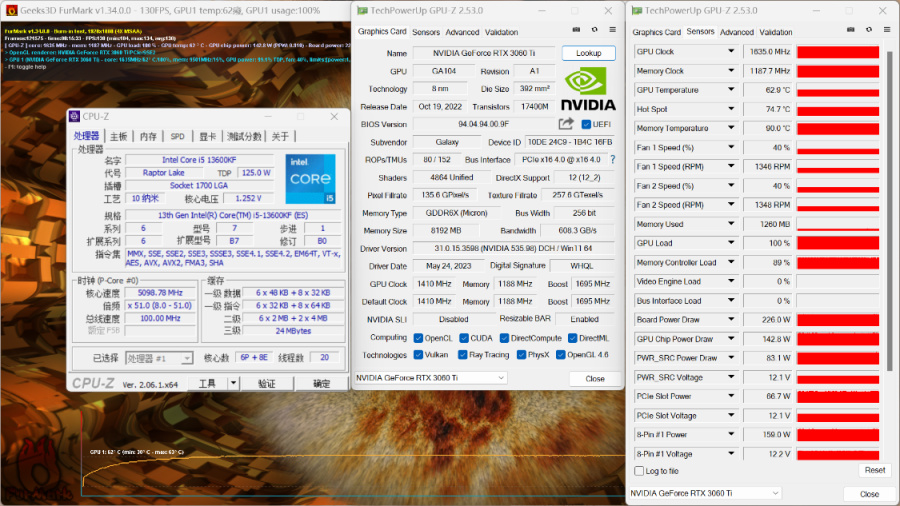 FurMark烤機測試,機箱內環境,烤機15 Min,顯卡溫度62.9°左右,顯卡功耗230W左右;