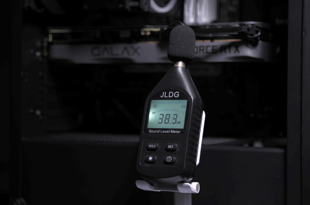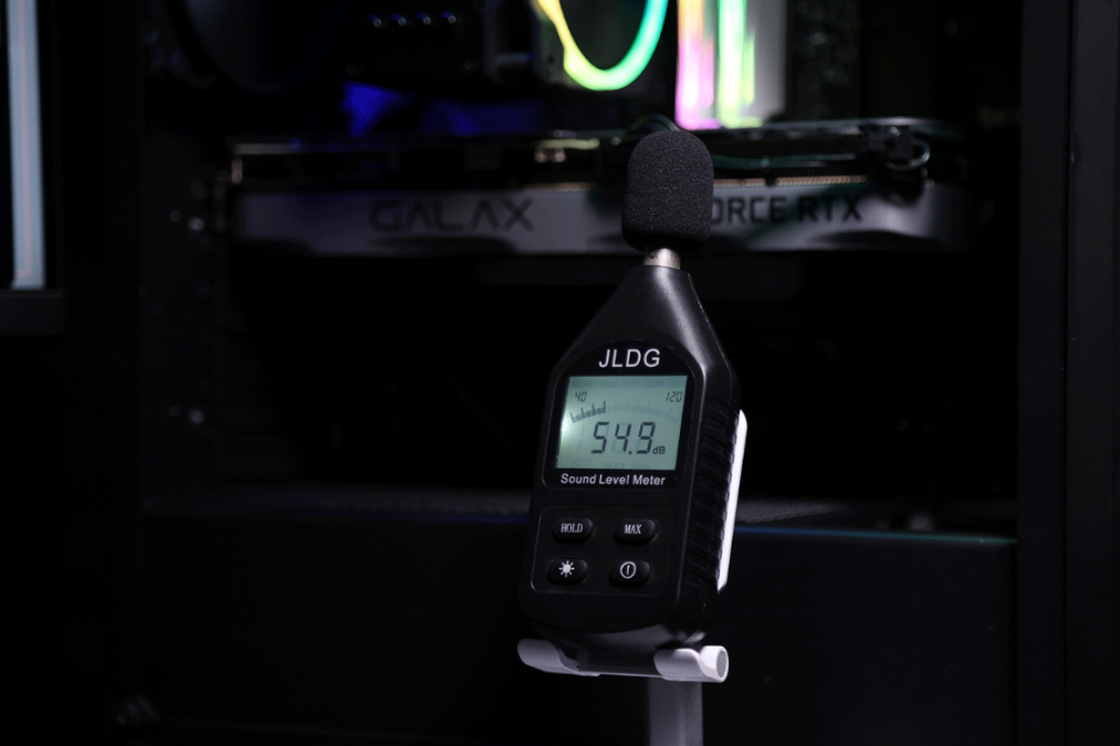 手動將機箱內部風扇全部手動鎖定爲100%轉速時,機箱附近的噪音值爲54.9dB(A)左右;