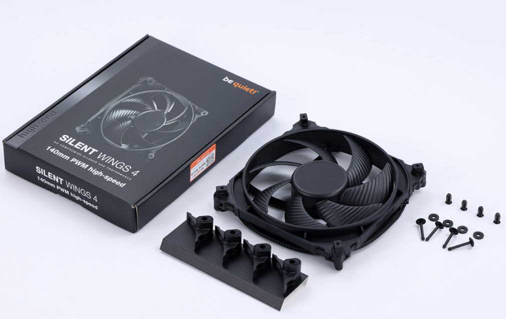 再來看Silent Wings 4 140mm高速風扇。風扇提供了2種不同的替換支架,除了預裝到風扇上的減震橡膠支架以外,還附贈了一組常規的硬塑料螺絲支架。配件包內同樣也附贈了4顆風扇螺絲、4個減震墊圈以及4個塑料插栓;